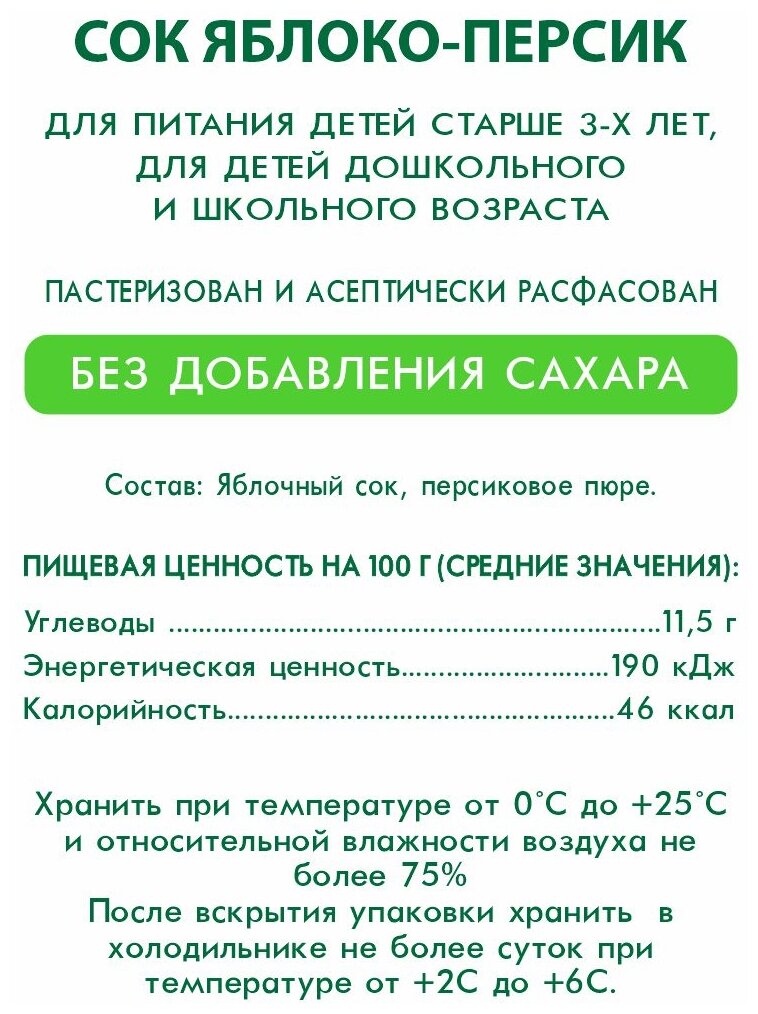 | Состав | яблочный сок, персиковое пюре. изготовлен из концентрированных сока и пюре. |