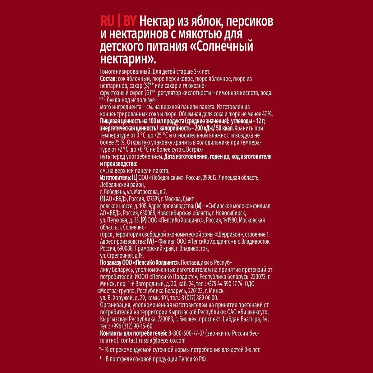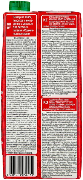 | Состав | Сок яблочный, персиковое пюре, пюре нектариновое, пюре яблочное, сахар или сахар и глюкозно-фруктозный сироп, регулятор кислотности - лимонная кислота, вода. Изготовлен из концентрированных соков и пюре |