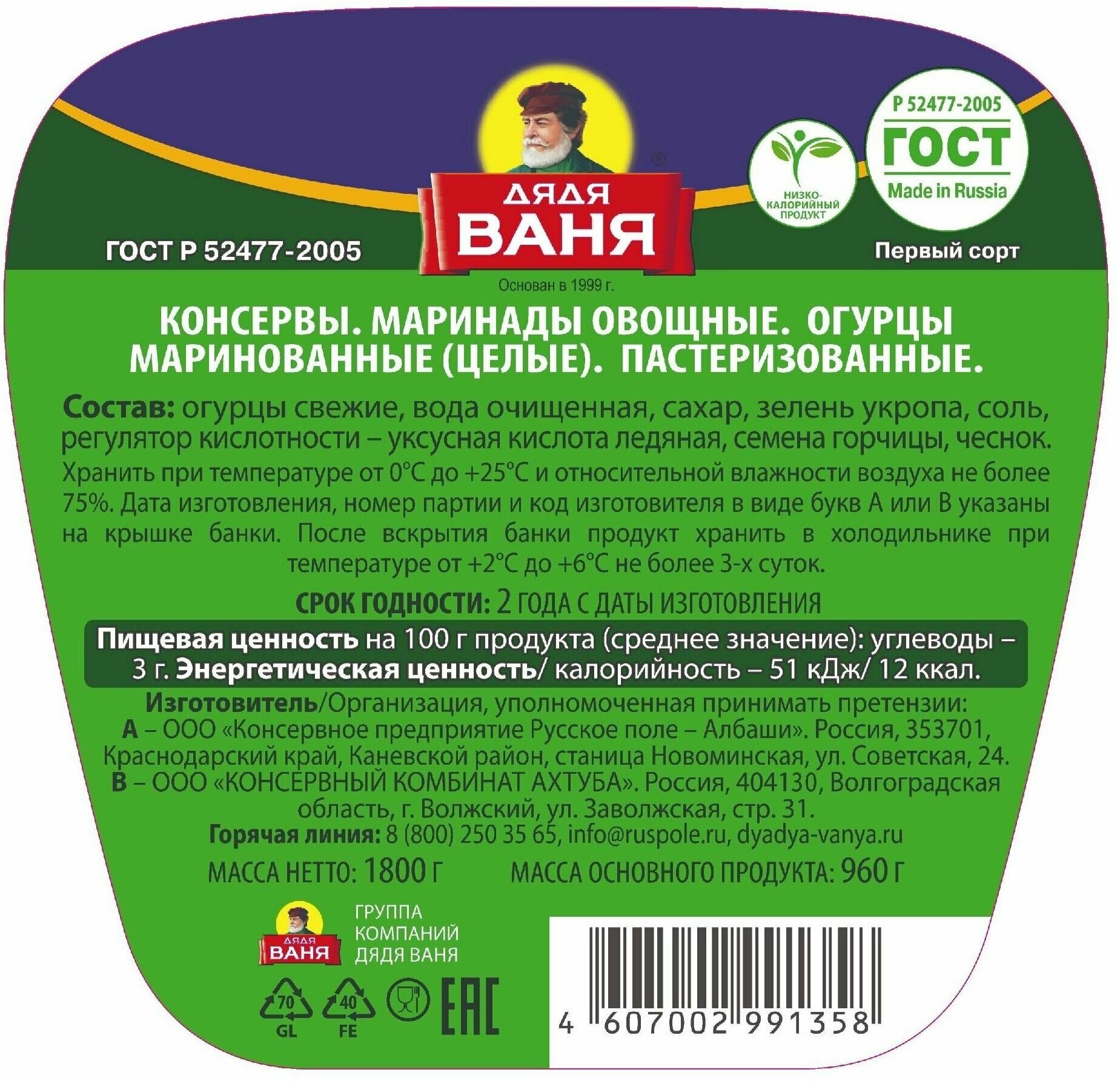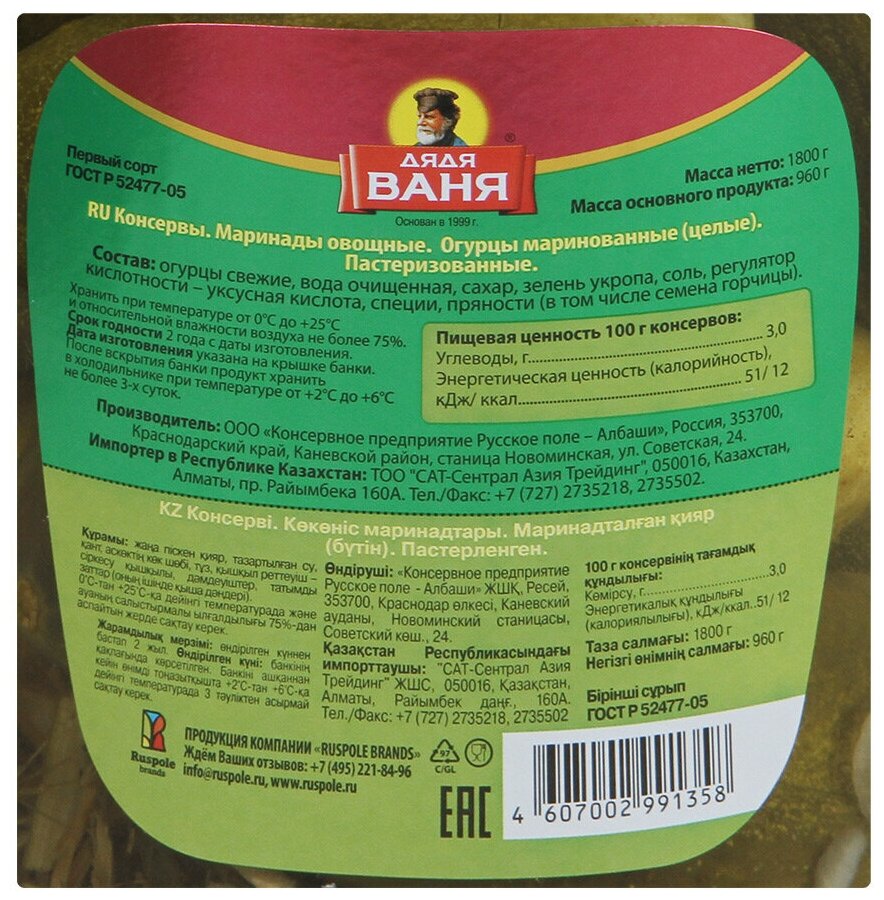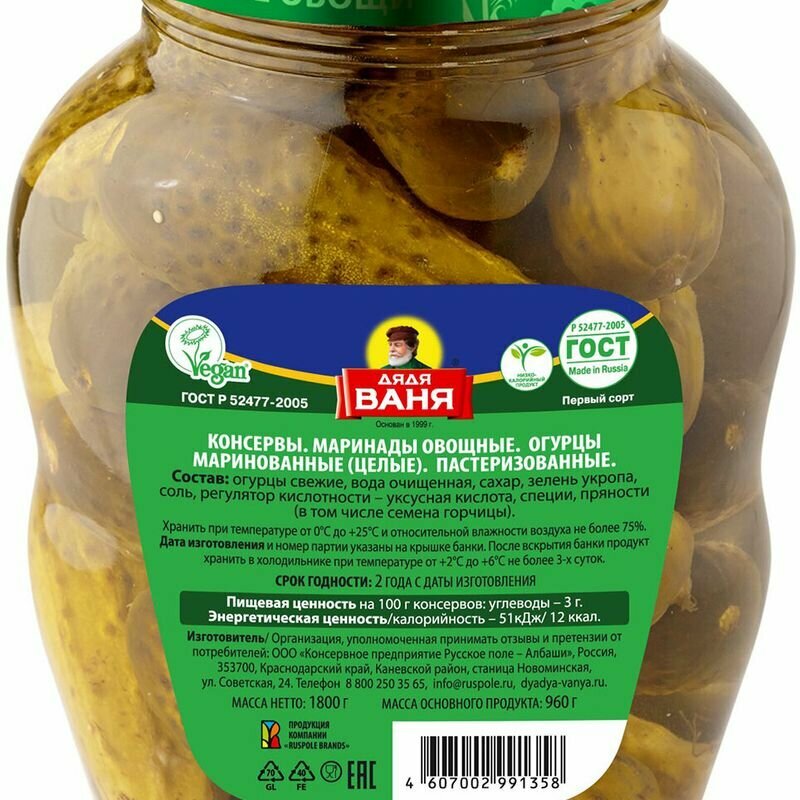 Огурчики Дядя Ваня маринованные 1.8кг Консервное предприятие Русское поле - Албаши