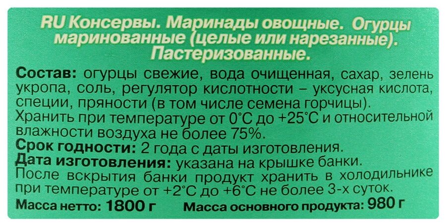 | Состав | огурцы свежие, вода очищенная, зелень укропа, сахар, соль, регулятор кислотности |