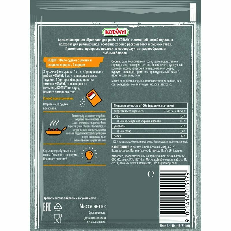 Приправа Kotanyi для рыбы 26г это настоящая находка для всех ценителей средиземноморской кухни. Изготовлена из 100% натуральных ингредиентов без добавления красителей, консервантов и усилителей вкуса. Содержит лимонную цедру, розмарин, кориандр, имбирь и прочие компоненты, которые сделают вашу рыбку еще вкуснее, ароматнее и аппетитнее. Приправа идеально подойдет не только для рыбных блюд, но и для морепродуктов. Kotanyi это тщательно отобранные травы и специи со всего мира. Все сырье подвергается лабораторным исследованиям, поэтому вы можете быть уверены в превосходном качестве и безопасности продукции бренда.