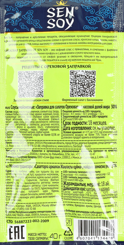 Заправка Sen Soy Premium Ореховая для салатов 40г Состра