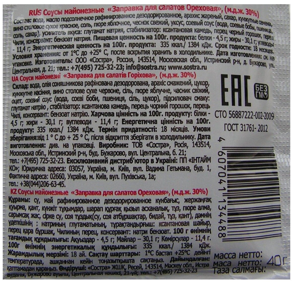 | Состав | Вода, масло подсолнечное, соевый соус (вода, соевые бобы, пшеница, соль); арахис жареный, сахар, кунжутные семена, вино столовое сухое красное, соль, пюре яблочное, паста Чесночная (свежий чеснок, вода, соль, регулятор кислотности: лимонная кислота); регулятор кислотности: уксусная кислота; усилитель вкуса и аромата |