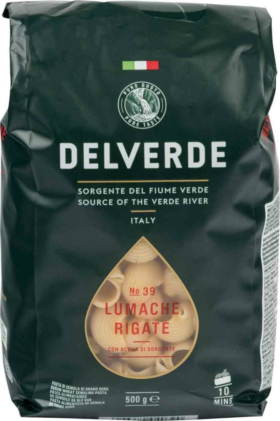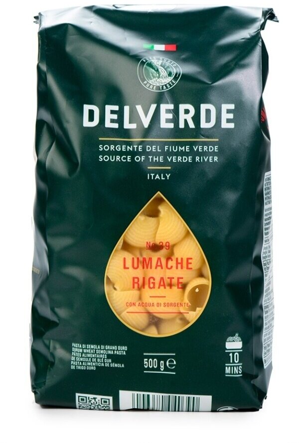 Макароны Delverde Lumache Rigate №39 500г приготовлены из лучших зерен твердых сортов пшеницы и кристально чистой воды. Холодная от природы, родниковая вода из национального парка Майелла в итальянском регионе Абруццо помогает сохранить уникальный вкус пшеницы. Благодаря старинному способу приготовления пасты с помощью бронзовой пресс-формы поверхность макаронных изделий получается шершавой, и за счет этого они лучше удерживают соус. Сушка при низких температурах сохраняет полезные свойства пшеничного зерна. Чтобы получить идеальный вкус al dente, лумаке ригате (ракушки) рекомендуется варить 9 минут. Производитель предлагает приготовить из этого вида пасты холодный салат с горохом и жареным перцем.