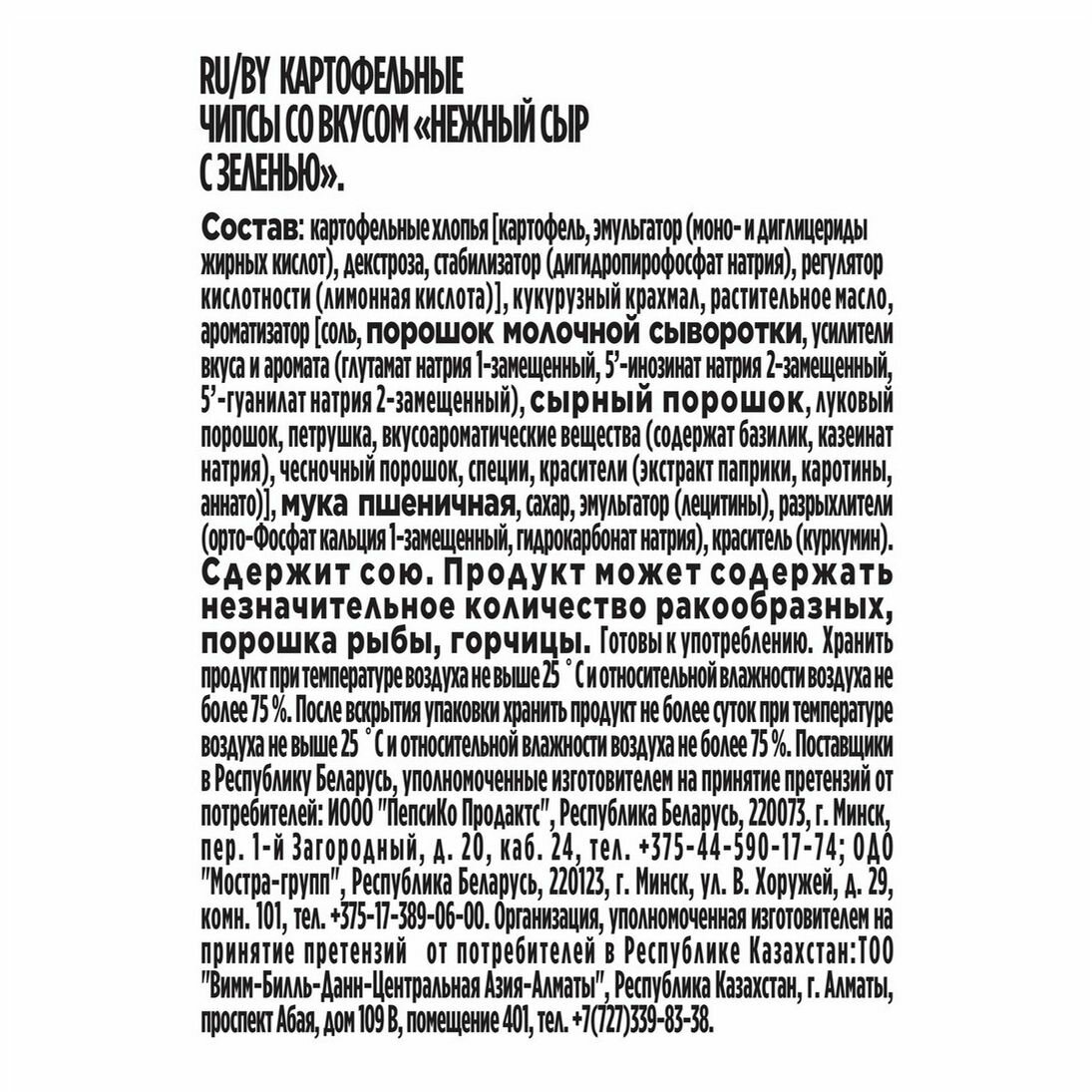 | Состав | Картофельные хлопья (картофель, эмульгатор (моно- и диглицериды жирных кислот), декстроза, стабилизатор (дигидропирофосфат натрия), регулятор кислотности (лимонная кислота)), кукурузный крахмал, растительное масло, комплексная пищевая добавка (соль, мука пшеничная, усилители вкуса и аромата (глутамат натрия 1-замещённый, 5-гуанилат натрия 2-замёщенный 5-инозинат натрия 2-замещённый), сахар, вкусоароматические вещества (содержат экстракт грибов, луковый порошок, чесночный порошок, экстракт паприки), специи, лактоза (из молока), гидролизованный белок кукурузы (содержит сою), регуляторы кислотности (лактат кальция, лимонная кислота), термический технологический ароматизатор, красители (экстракт паприки, сахарный колер IV), мука пшеничная, сахар, эмульгатор (соевый лецитин), разрыхлители (орто-Фофсфат кальция 1-замещённый, гидрокарбонат натрия), краситель (куркумин) |