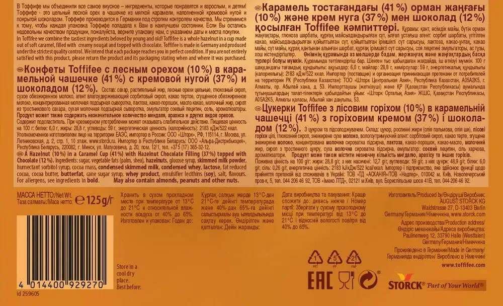 Конфеты Toffifee 125г - это оригинальное лакомство из Германии, известное всему миру уже более 40 лет. Toffifee - не просто конфета, а настоящее произведение кондитерского искусства. Сначала отливается маленькая чашечка из мягкой карамели; затем в нее кладется цельный лесной орех, обжаренный до особого аромата и хруста; сверху на орех выливается кремовая нуга из натуральной ореховой пасты, перемешанной с отборным какао; завершает эту искусную кондитерскую композицию капля великолепного молочного шоколада. Конфеты выложены на подложку-коррекс и упакованы в герметичный пакет и картонную коробку. Всего в упаковке - 15штук.