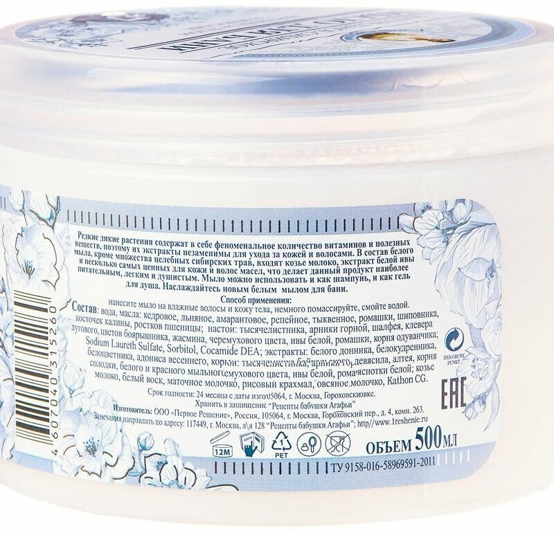 Сервис сравнения цен СкидкаГИД предлагает сравнить цены на товар «Мыло для бани Белое Мыло Агафьи 500мл Первое Решение»