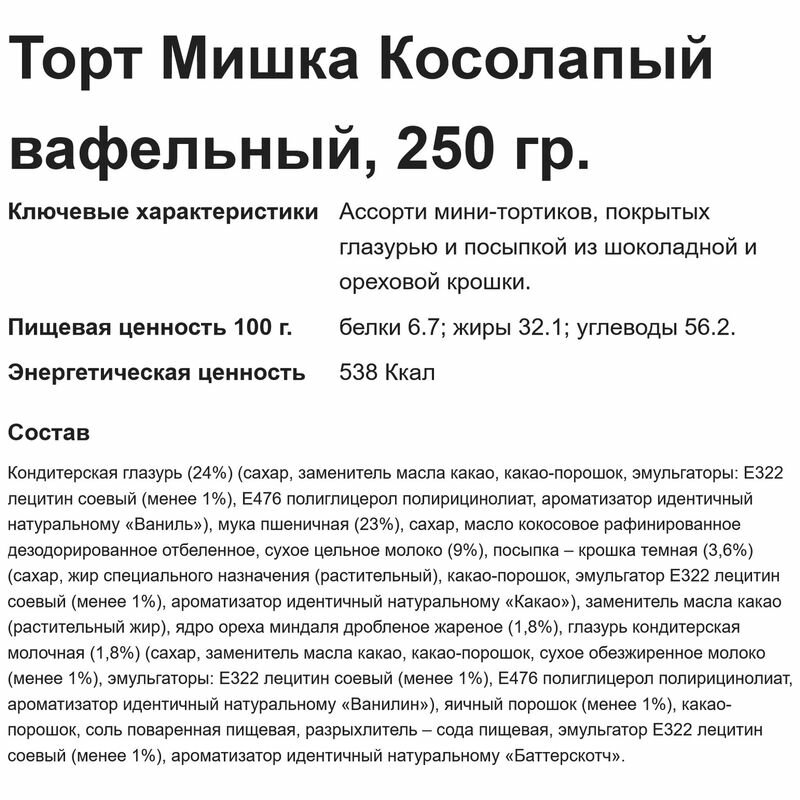 На сегодняшний день товар «Вафельный торт Мишка косолапый 250г Красный Октябрь» можно купить с кешбеком в 3 магазинах: Яндекс Еда, Vprok (Перекресток), Яндекс.Маркет