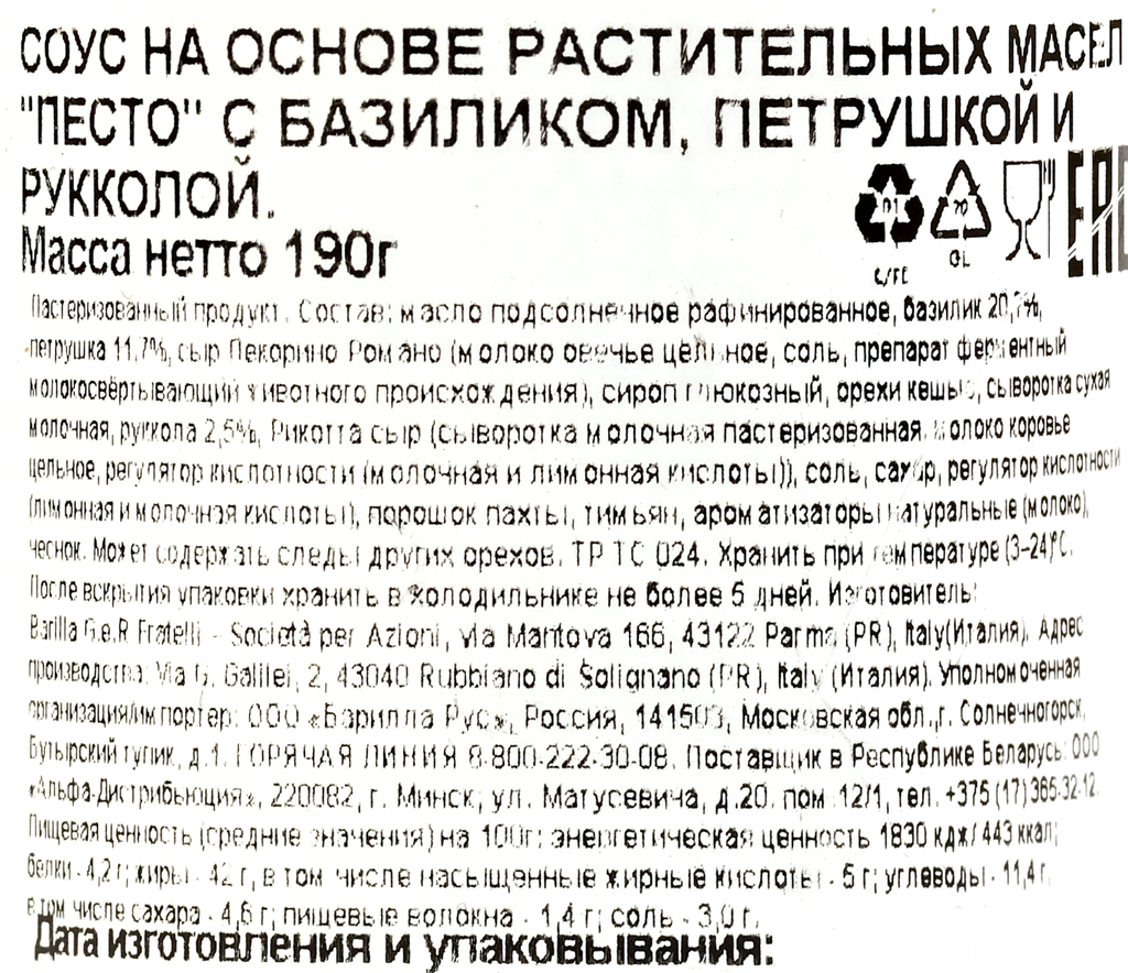 | Состав | Масло подсолнечное 38,5%, базилик 20,7%, петрушка 11,8%, глюкозный сироп, сыр Пекорино Романо, орехи кешью, сыворотка молочная, сыр Рикотта (сыворотка молочная, молоко), соль, Руккола 1,5%, майоран, сахар, тимьян, пахта (молоко), регулятор кислотности - кислота лимонная, натуральный ароматизатор (молоко), чеснок. |