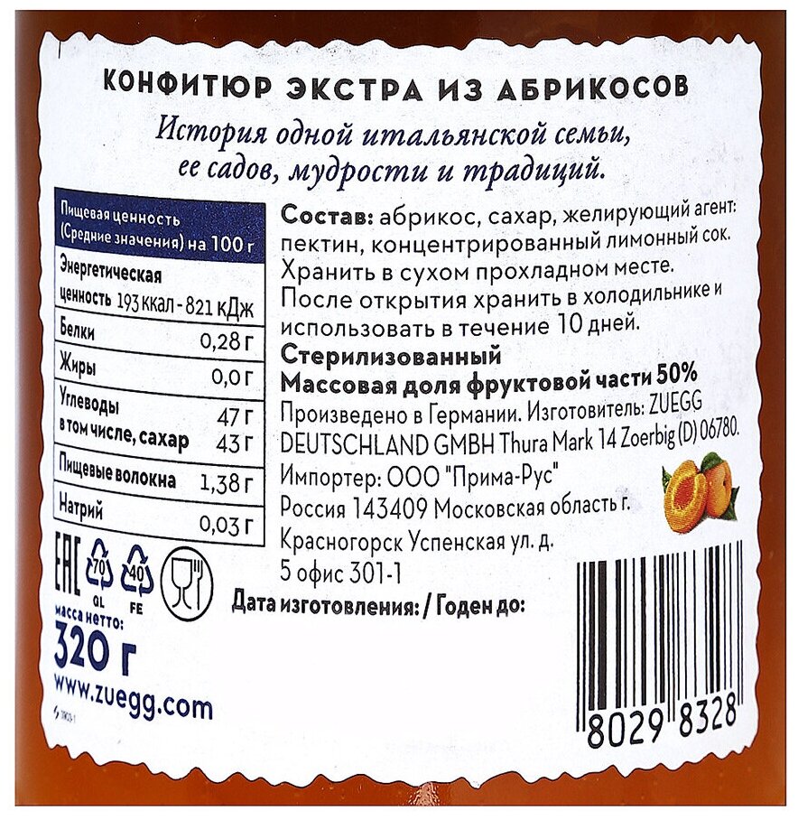 Конфитюр Zuegg Экстра Абрикос 320г - это 100% натуральный продукт, приготовленный из сладких сочных абрикосов и сахара с добавлением пектина и лимонного сока. Все фрукты и ягоды для продукции итальянского бренда Zuegg полностью вызревают под солнцем и собираются на пике спелости. В тот же день они подвергаются переработке, поэтому сохраняют максимальное количество полезных веществ, подаренных им природой. Конфитюр не содержит консервантов и искусственных добавок, упакован в стеклянную банку с герметичной крышкой.