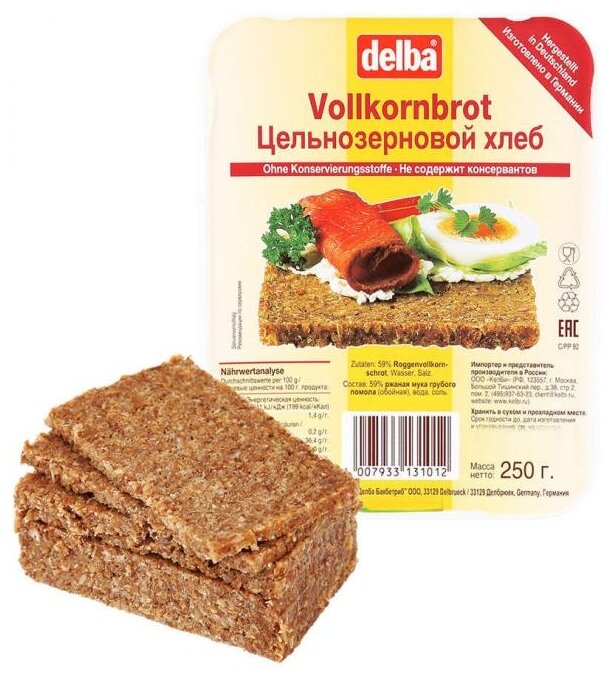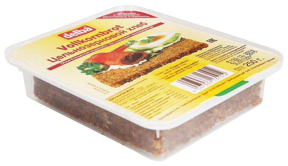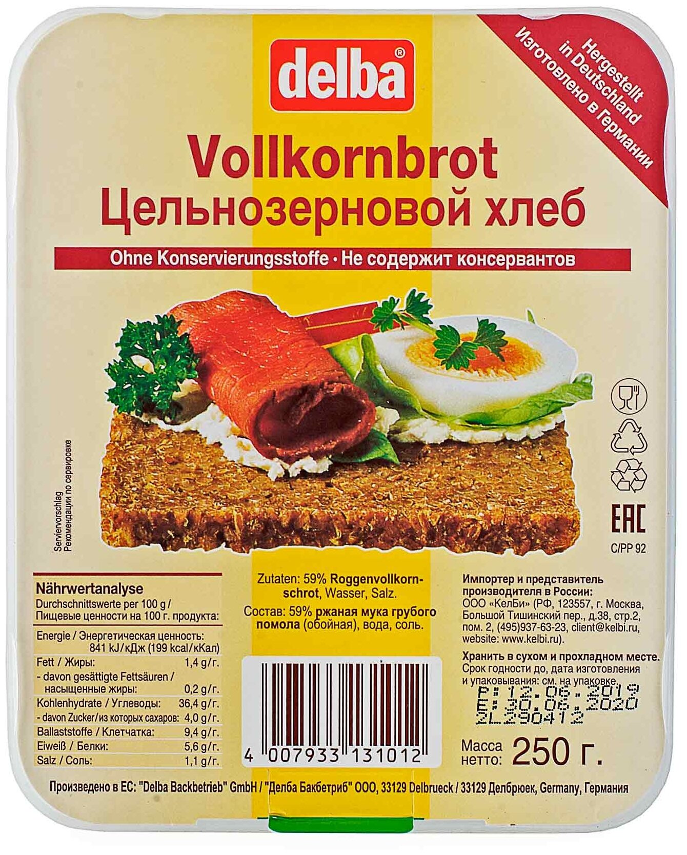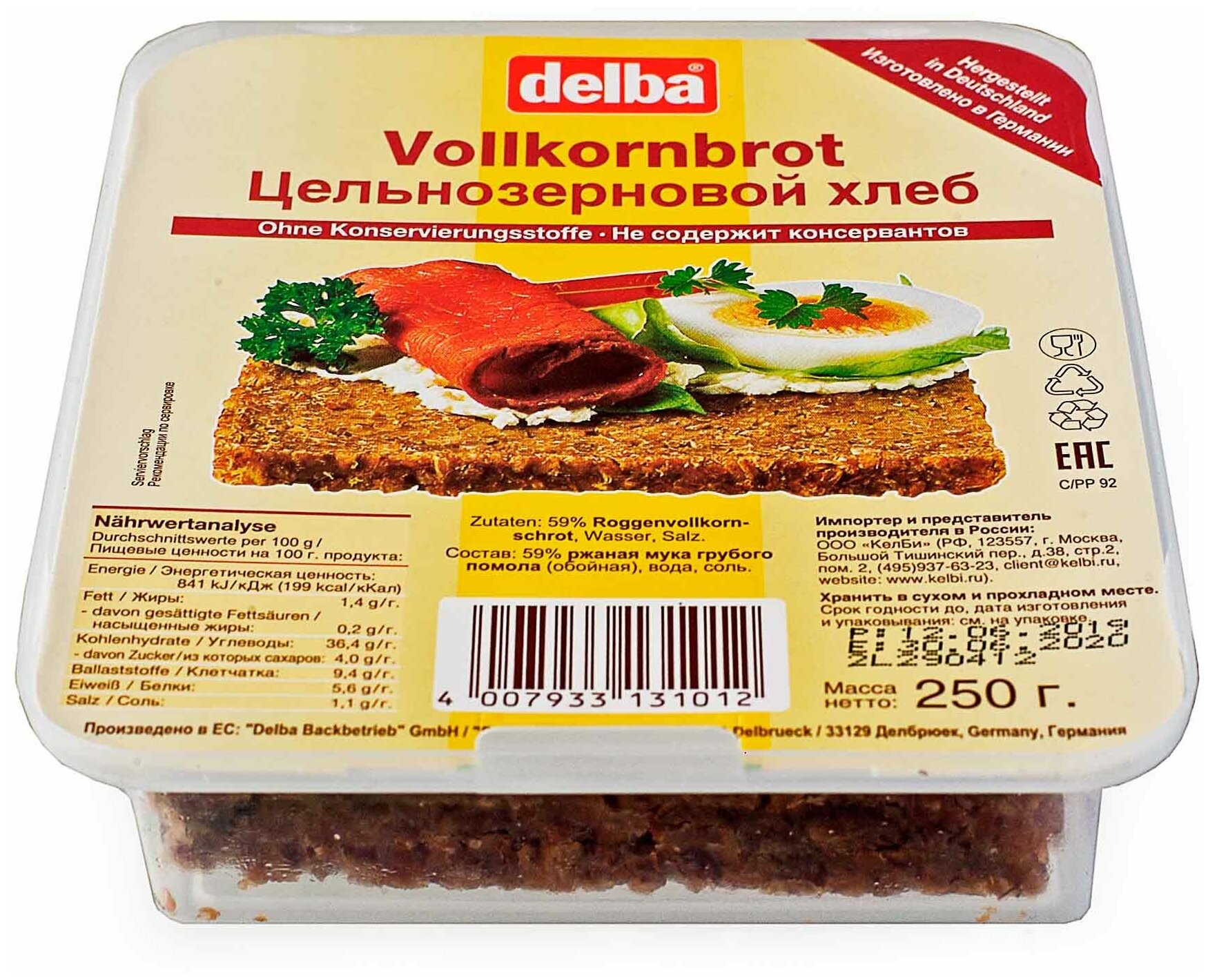 Хлеб Delba ржаной цельнозерновой 250г - инновационный немецкий продукт на хлебном рынке. В его составе всего три ингредиента: ржаная мука грубого помола, вода и соль. Никаких дрожжей, консервантов, улучшителей вкуса и химических добавок. Щадящая обработка позволила сохранить все полезные вещества, витамины и минералы, которые содержит цельное зерно. Это питательный, богатый клетчаткой и диетический продукт. Имеет слегка влажную текстуру. Специальный герметичный бокс гарантирует свежесть и неизменное качество в течение всего срока годности.