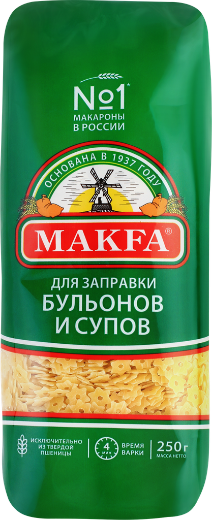 Макароны Makfa Звездочки 250г производятся по классическому рецепту из крупки твердых сортов пшеницы (дурум) и чистой воды. При варке они сохраняют не только свою форму, но и полезные свойства зерна. Маленькие звездочки - это короткий формат пасты, который лучше всего подходит для приготовления супов, творожных и овощных запеканок, а также гарнира для детских блюд. Чтобы получить правильную текстуру al dente, такие макароны следует варить в кипящей подсоленной воде в течение 2-3 минут. Продукт не содержит ГМО и соответствует стандартам ГОСТ.