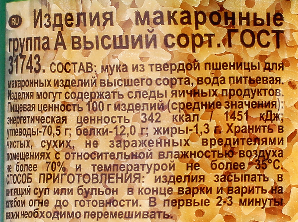 | Состав | Мука из твердой пшеницы для макаронных изделий высшего сорта, вода питьевая. Без пищевых добавок и красителей |