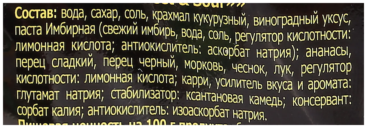 | Состав | вода, сахар, соль, виноградный уксус, паста имбирная (свежий имбирь, вода, соль, регулятор кислотности лимонная кислота), ананасы консервированные, крахмал кукурузный, перец сладкий, перец черный, морковь, чеснок, лук, регулятор кислотности лимонная кислота, приправа карри, усилитель вкуса и аромата глутамат натрия, стабилизатор ксантановая камедь, консервант сорбат калия, антиокислитель изоаскорбат натрия. |