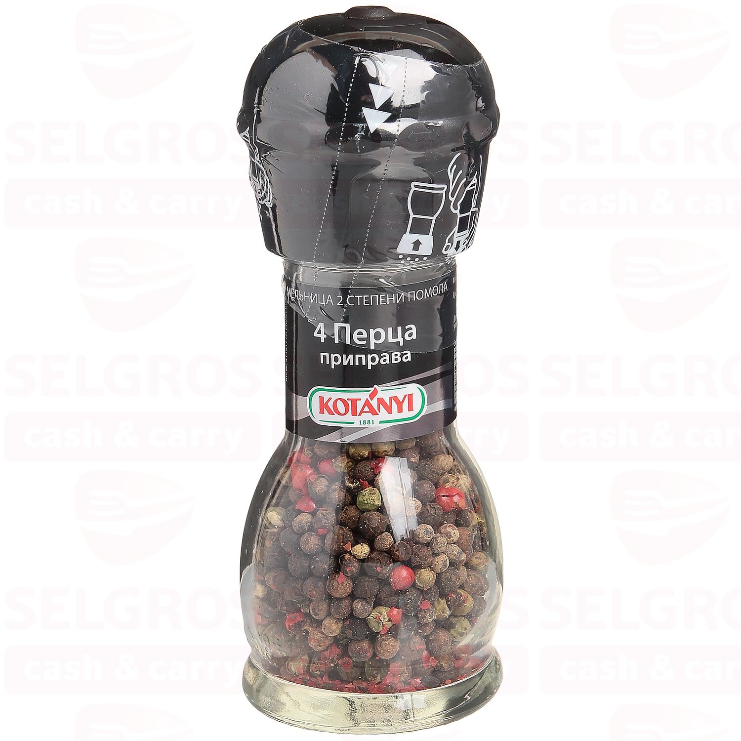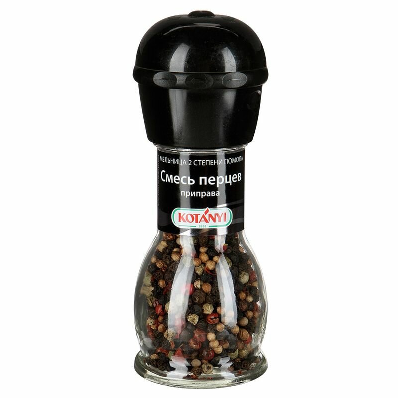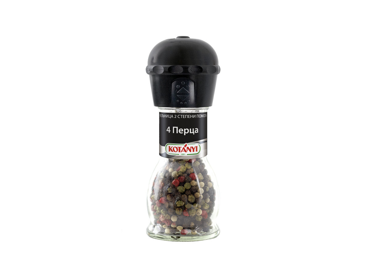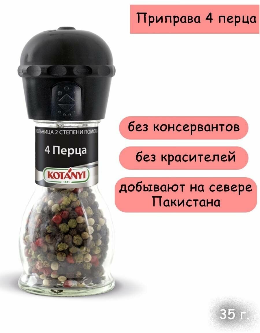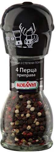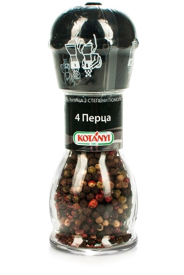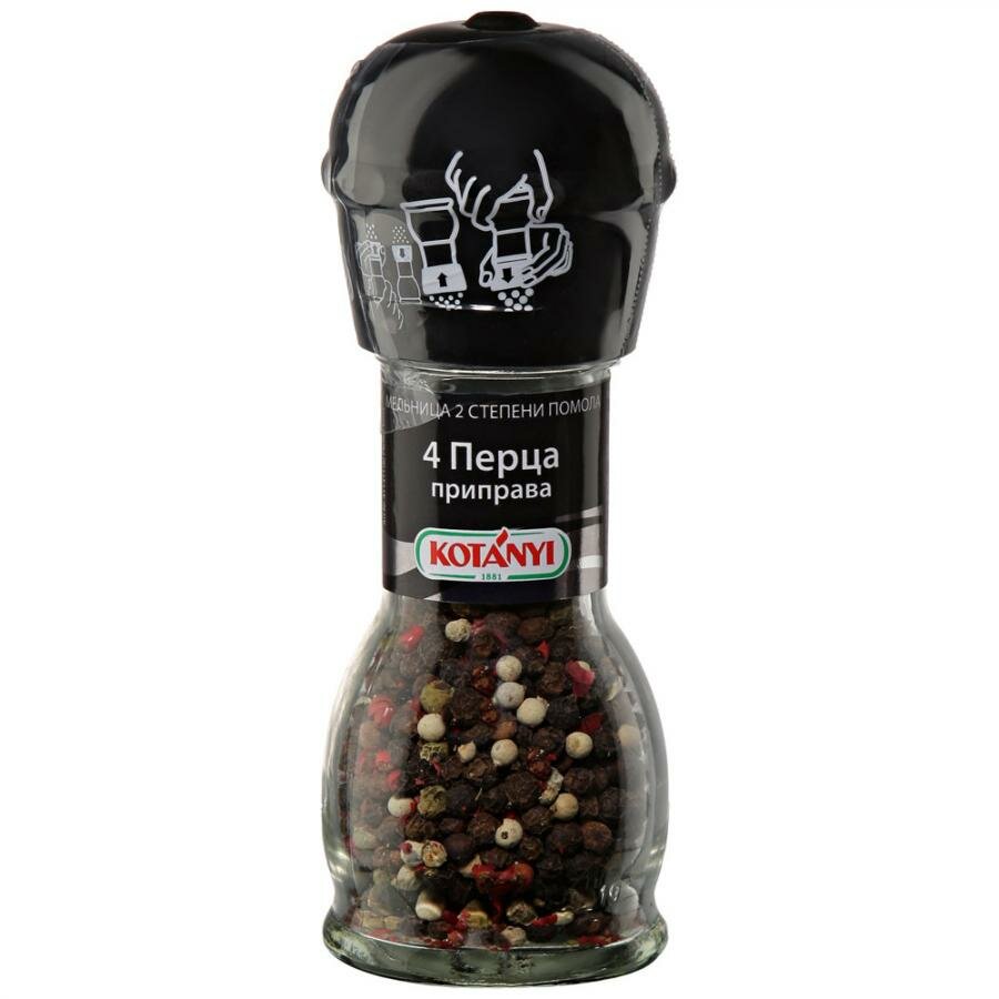 Приправа Kotanyi 4 Перца 35г - смесь черного, белого, зеленого и розового перцев от известного австрийского производителя. Это абсолютно универсальные специи, которые можно использовать для приготовления соусов, салатов, первых блюд, горячего, выпечки и коктейлей. С такой удобной мельницей вы сможете по достоинству оценить все преимущества свежемолотого перца. Пластиковый механизм на крышке имеет две степени помола. Чтобы выбрать крупный, переверните мельницу и опустите механизм до щелчка. Чтобы использовать мелкий помол, поднимите механизм по стрелочкам. Подходит для сервировки стола.