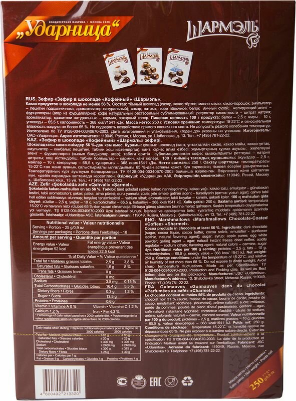 Зефир Шармэль Кофейный в шоколаде 250г - это элегантный десерт от известной кондитерской фабрики "Ударница" со вкусом и ароматом натурального кофе. Такое нежное воздушное лакомство в шоколадной глазури может позволить себе любая женщина. Его сердцевинка приготовлена по традиционному рецепту из яблочного пюре, яичного белка и агара, желирующего вещества на основе вытяжки из бурых морских водорослей. Сверху изделие покрыто великолепным темным шоколадом. Непревзойденное сочетание тающей во рту начинки и хрустящей оболочки не оставит равнодушным ни одного ценителя сладостей. Вся продукция делается исключительно из безглютенового сырья и не содержит ГМО.