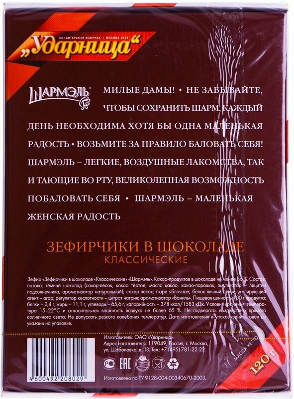 Зефир Шармэль Классический в шоколаде 120г - это элегантный десерт от известной кондитерской фабрики "Ударница". Такое нежное воздушное лакомство в шоколадной глазури может позволить себе любая женщина. Сердцевинка зефирчика приготовлена по традиционному рецепту из яблочного пюре, яичного белка и агара, желирующего вещества на основе вытяжки из бурых морских водорослей. Сверху изделие покрыто великолепным темным шоколадом. Непревзойденное сочетание тающей во рту начинки и хрустящей оболочки не оставит равнодушным ни одного ценителя сладостей. Вся продукция делается исключительно из безглютенового сырья и не содержит ГМО.