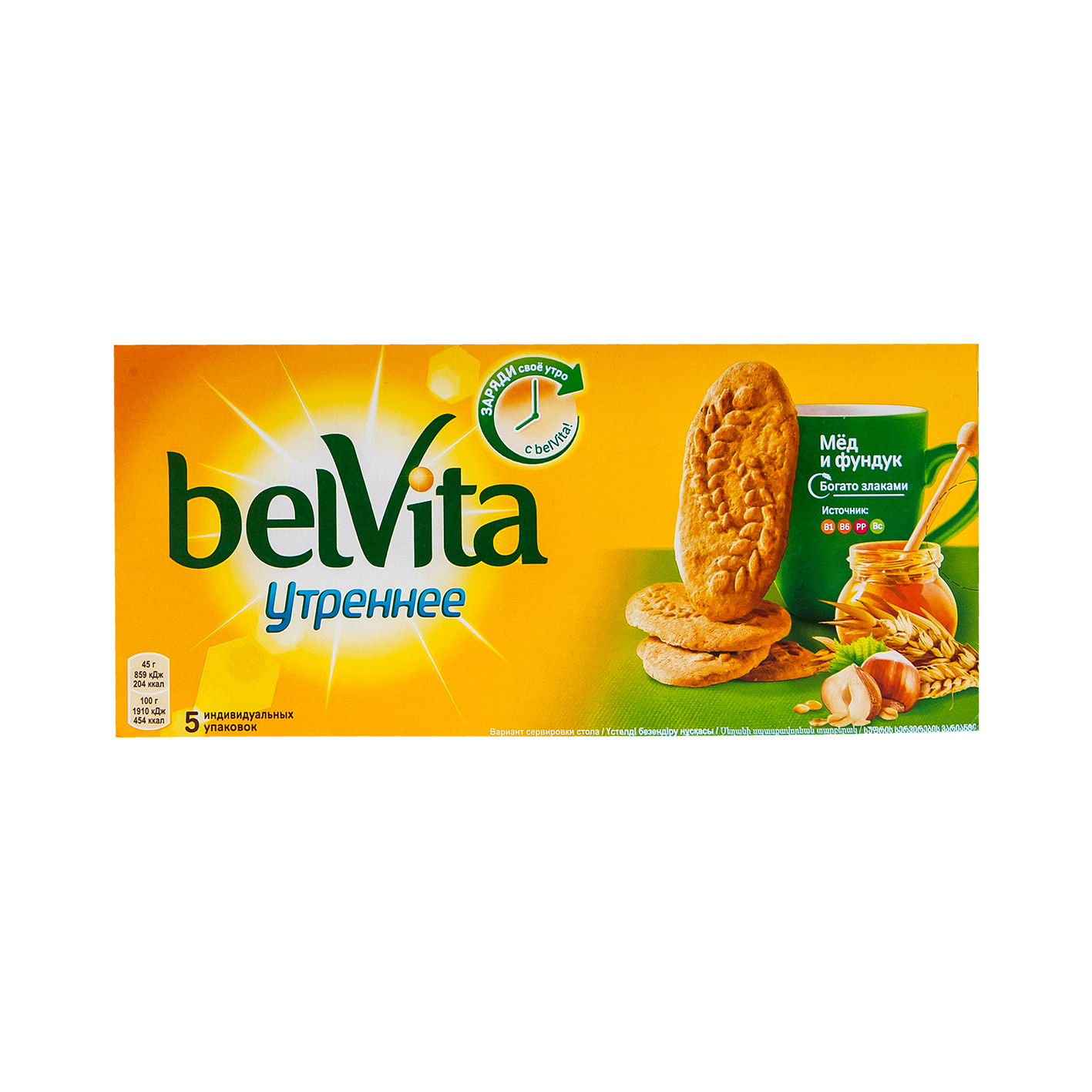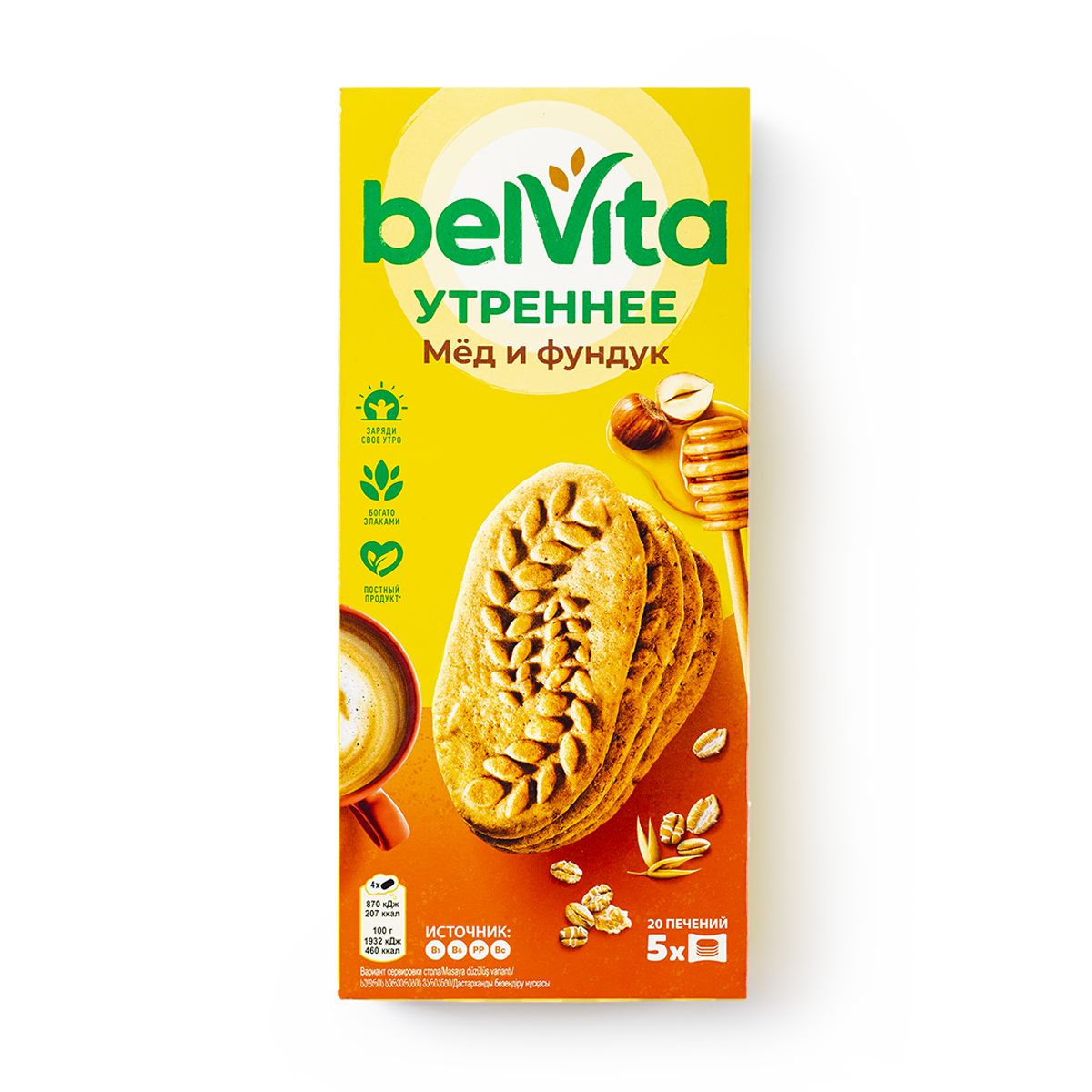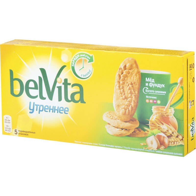 Печенье Belvita Утреннее Медовое с фундуком 225г создано специально для вкусных, сытных и полезных завтраков. Сбалансированный состав с медом и орешками, обогащенный витаминно-минеральным комплексом, а также злаковыми хлопьями и отрубями, подарит вам энергию и наладит хорошее пищеварение с самого утра. Печенья легко ломаются и буквально тают во рту. Они подходят и для взрослых завтраков с кофе, и для детских - с чаем, соком или кисломолочными продуктами. В коробке - 5 герметичных пакетиков по 4 штучки в каждом. Такие порционные пакетики удобно брать с собой в дорогу или на работу, давать ребенку в школу или на прогулку.