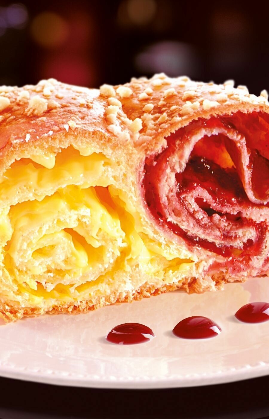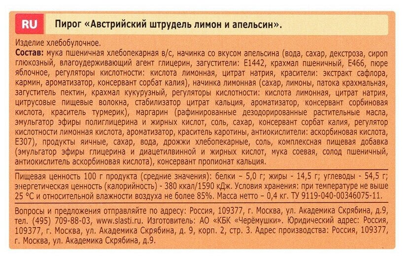 Описание товара:Ароматный штрудель по оригинальной рецептуре с двумя начинками.Состав товара:Мука пшеничная хлебопекарная в/с, начинка со вкусом апельсина (вода, сахар, декстроза, сироп глюкозный, влагоудерживающий агент глицерин, загустители: Е1442, крахмал пшеничный, Е466, пюре яблочное, регуляторы кислотности: кислота лимонная, цитрат натрия, красители: экстракт сафлора, кармин, ароматизатор, консервант сорбат калия), начинка лимонная (сахар, лимоны, патока крахмальная, загуститель пектин, крахмал кукурузный, регуляторы кислотности: кислота лимонная, цитрат натрия, цитрусовые пищевые волокна, стабилизатор цитрат кальция, ароматизатор, консервант сорбиновая кислота, краситель турмерик), маргарин (рафинированные дезодорированные растительные масла, эмульгатор эфиры полиглицерина и жирных кислот, соль, сахар, консервант сорбат калия, регулятор кислотности лимонная кислота, ароматизатор, краситель каротины, антиокислители: аскорбиновая кислота, Е307), продукты яичные, сахар, вода, дрожжи хлебопекарные, соль, комплексная пищевая добавка (эмульгатор эфиры глицерина и диацетилвинной и жирных кислот, мука соевая, солод пшеничный, антиокислитель аскорбиновая кислота), консервант пропионат кальция. ТУ 9119-040-00346075-11.