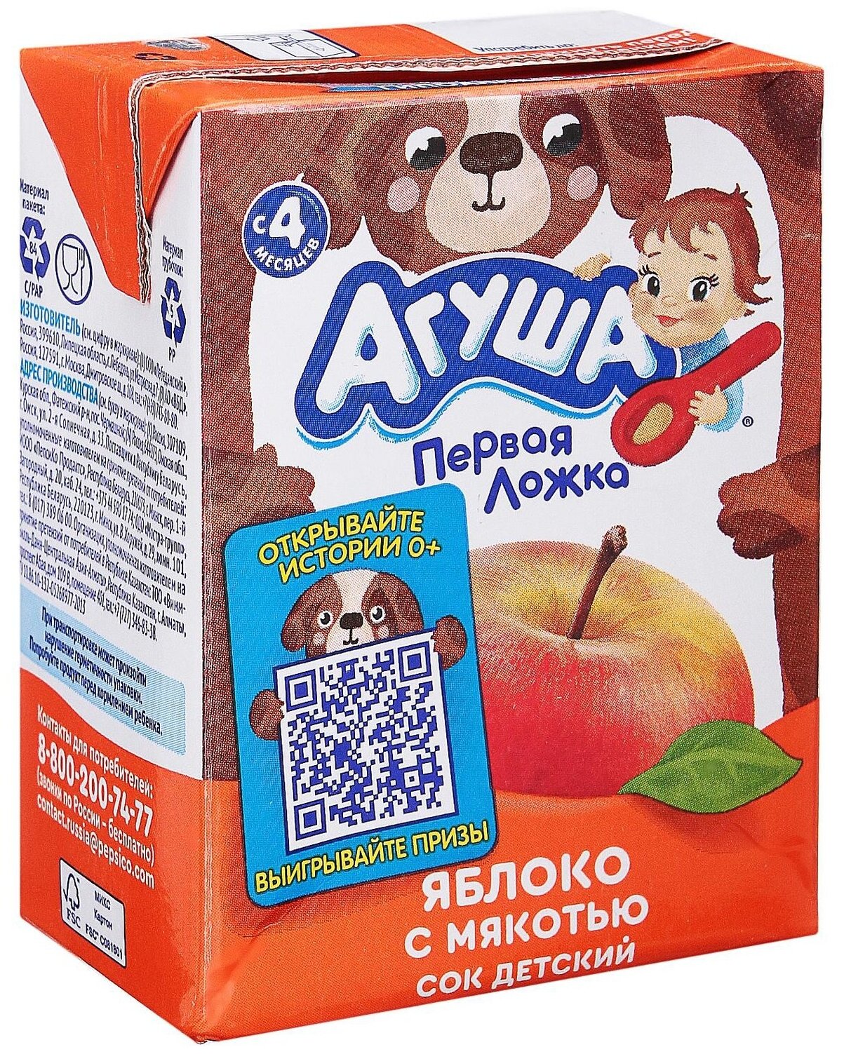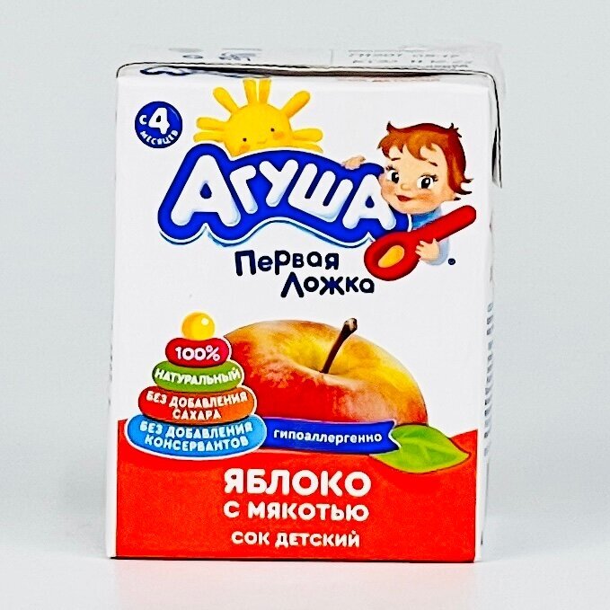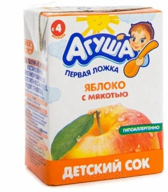 Сок Агуша Яблоко с мякотью 200мл изготовлен исключительно из сока и пюре спелых яблок без добавления сахара, консервантов и красителей. Как и вся продукция бренда, проходит 72 проверки качества - от сбора урожая до доставки в магазины. Рекомендуется давать детям с 4-месячного возраста, начиная с 0,5 чайной ложки в день, постепенно увеличивая к 12 месяцам до 100 грамм. Такую упаковку удобно брать с собой на прогулку. Обратите внимание: перед введением нового продукта в рацион ребенка обязательно проконсультируйтесь с вашим педиатром!