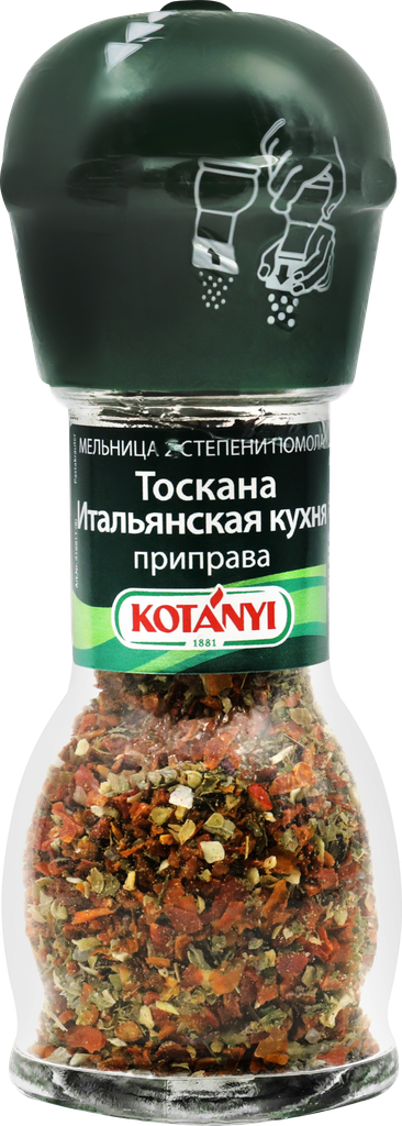 Приправа Kotanyi Тоскана Итальянская кухня 32г - это смесь сушеных томатных хлопьев и крупной морской йодированной соли с ароматными травами Средиземноморья (душистые базилик и петрушка, орегано, пряный чеснок и лук). Эта приправа отлично сочетается с пастой, подходит для приготовления густых соусов и тушеных овощей. Удобная мельница позволит вам по достоинству оценить все преимущества свежемолотых специй. Пластиковый механизм на крышке имеет две степени помола. Чтобы выбрать крупный, переверните мельницу и опустите механизм до щелчка. Чтобы использовать мелкий помол, поднимите механизм по стрелочкам. Подходит для сервировки стола.