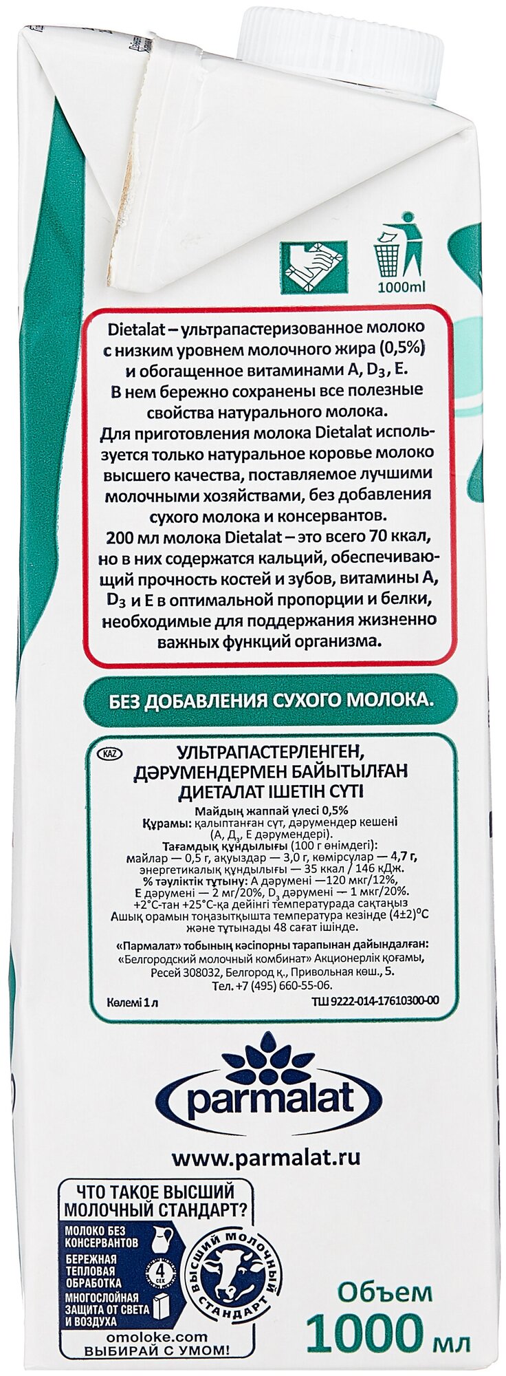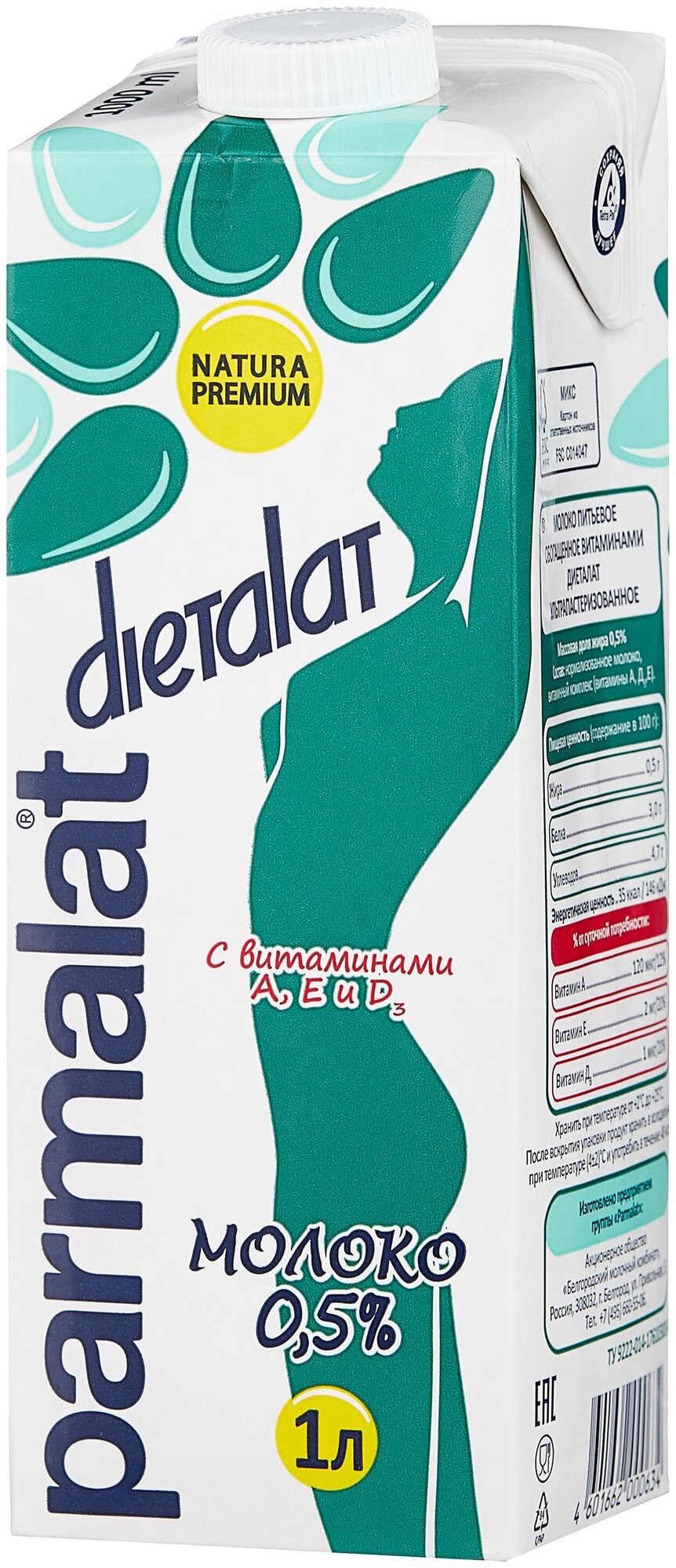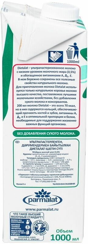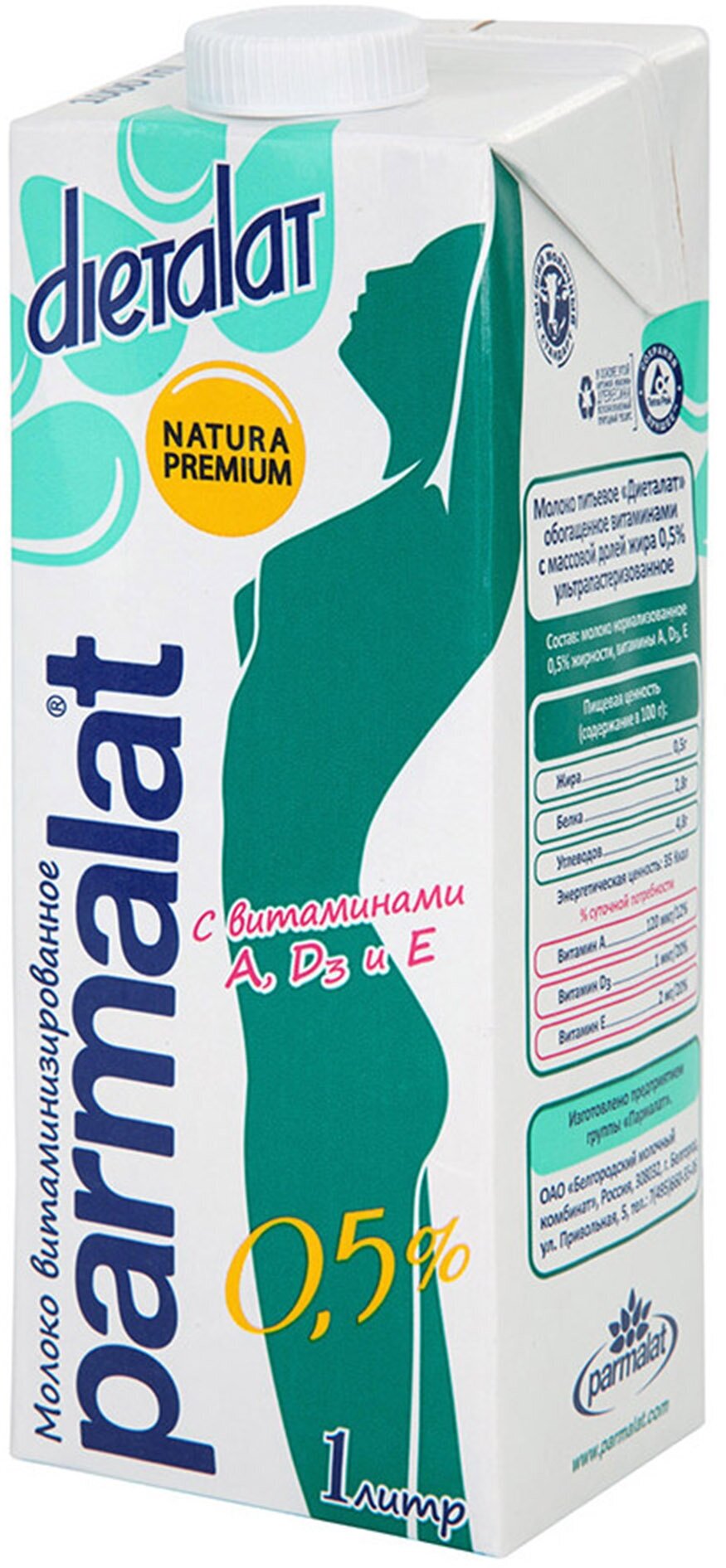 Молоко Parmalat Natura Premium Dietalat 0.5% 1л - это напиток минимальной жирности, приготовленный по европейским стандартам качества из отборного натурального молока и обогащенный витаминами А, D и E. Благодаря ультрапастеризации продукт сохранил все витамины и микроэлементы, которыми так славится свежее коровье молоко, при этом он может храниться дольше пастеризованного. Подходит для диетического питания. Не содержит сухое молоко, красители и консерванты. Расфасован в герметичный пакет с отвинчивающейся крышечкой.