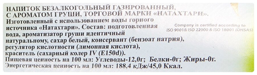 Описание товара:Лимонад со вкусом груши. Напиток газированный, изготовлен на основе очищенной воды из горного источника Натахтари.Состав товара:Подготовленная вода, ароматизатор груши идентичный натуральному, сахар белый, консервант (бензоат натрия), регулятор кислотности (лимонная кислота), краситель (сахарный колер IV (E150d)).