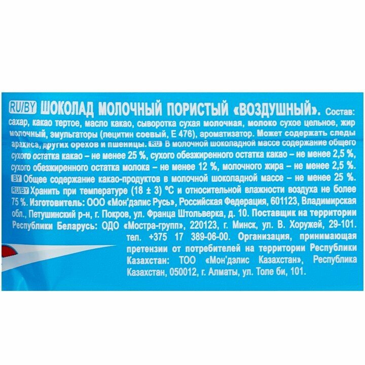 Шоколад Воздушный Молочный 85г Мондэлис Русь