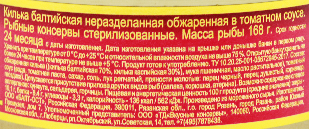 | Состав | рыба, масло растительное, томатная паста, сахар-песок, мука пшеничная, лук сушеный, соль поваренная, регулятор кислотности - кислота уксусная, специи |