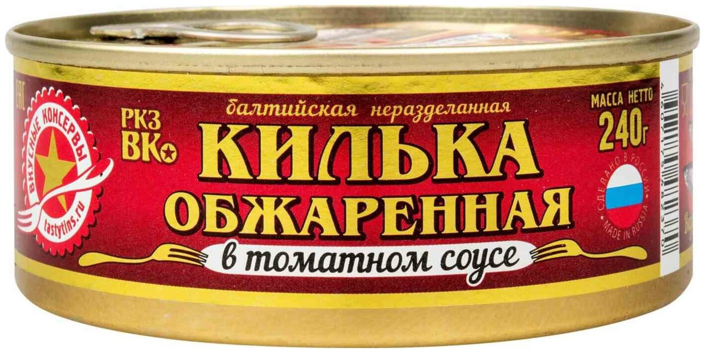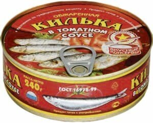 Килька Вкусные консервы в томатном соусе 240г производится по традиционному рецепту из балтийской кильки, обваленной в муке, обжаренной в растительном масле и залитой пряным соусом с томатами. Выловленная в Балтийском море, она отличается большим размером и жирностью по сравнению с черноморской, поэтому часто даже после обработки сохраняет свою форму и не разваливается на мелкие кусочки. Банка имеет жестяной ключ, благодаря чему открывается без усилий. Открытую банку рекомендуется хранить в холодильнике не больше 24 часов.
