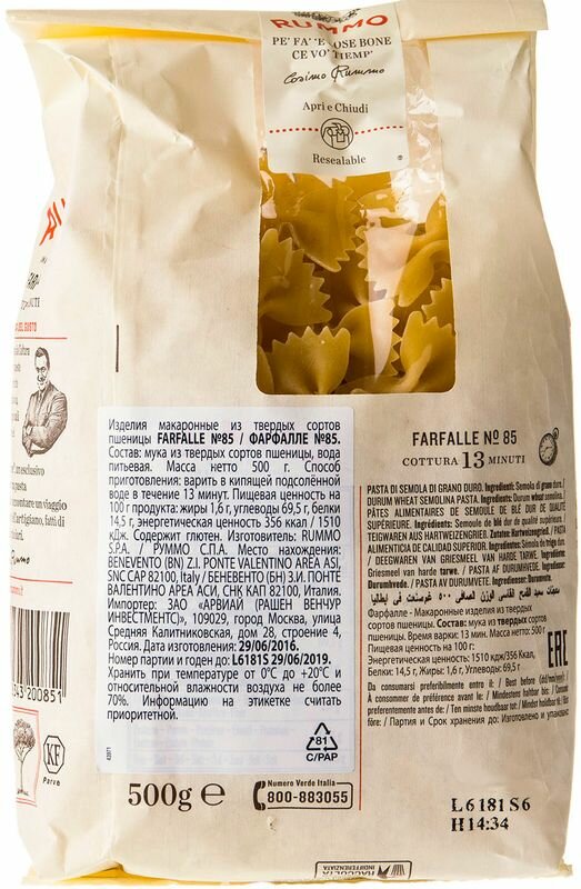 Макароны Rummo Farfalle №85 500г - это оригинальная итальянская паста, которая готовится по эксклюзивной технологии семьи Руммо с 1846 года. Метод Lenta Lavorazione означает традиционное медленное приготовление пасты, которая получится al dente, даже если вы ее немного передержите на огне. Фарфалле - это макароны средней длины (32мм), напоминающие аккуратные бантики. Они варятся немного дольше остальных видов (13 минут) и идеально сочетаются с нежными сливочными соусами, лососем и морепродуктами. Их можно использовать также для приготовления салатов и супов.