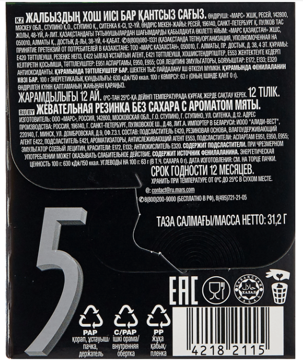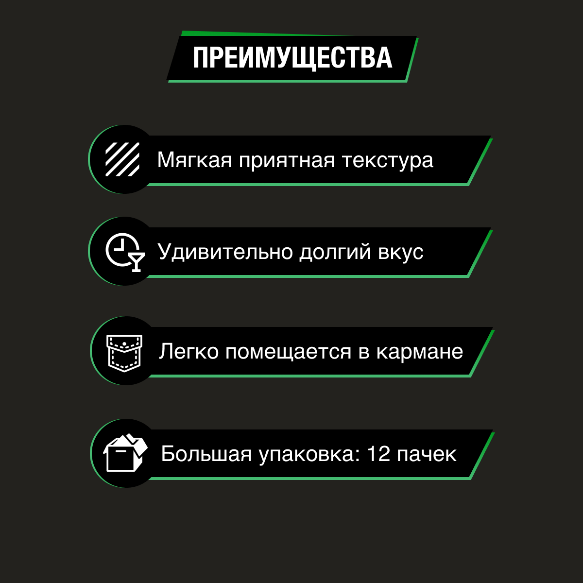 | Состав | сорбит е420, резиновая основа, влагоудерживающий агент е420, подсластитель маннит е421, ароматизаторы, аспартам е951, ацесульфам к е950, эмульгатор соевый лецитин, сукралоза е955, красители |