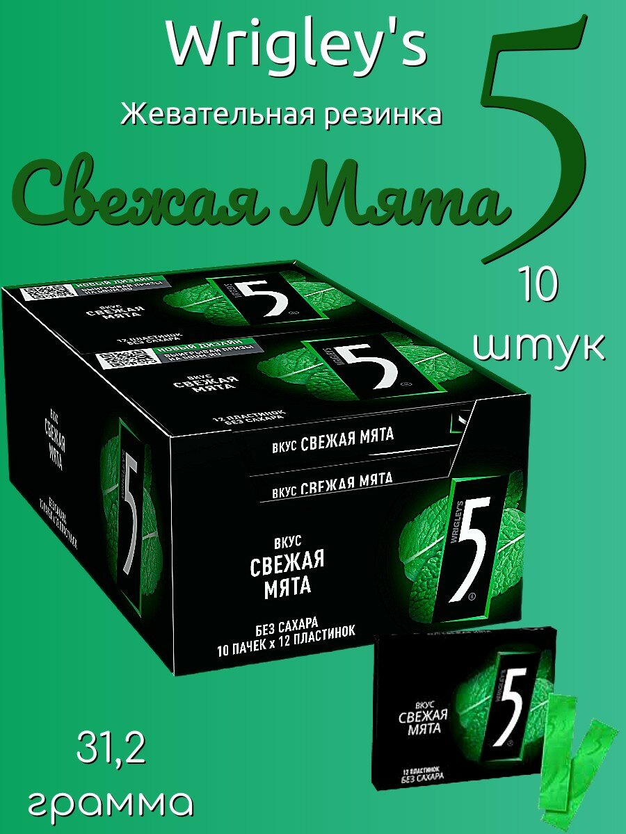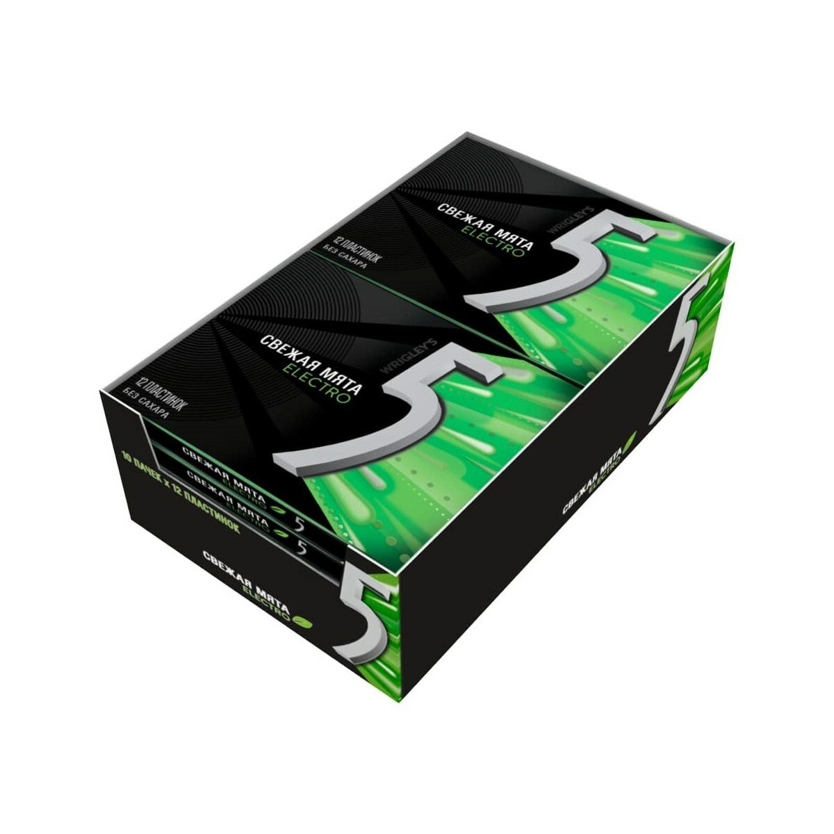 Wrigley's 5 Electro жевательная резинка, Свежая мята, Шоубокс, 10 шт.*31.2 гр. Жевательная резинка Five в формате пластинок со вкусом сладкой мяты. Обладает мягкой приятной текстурой и удивительно долгим вкусом, а стильная черная пачка легко помещается в кармане и в сумочке, не теряя форму.