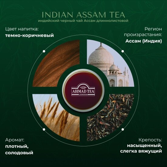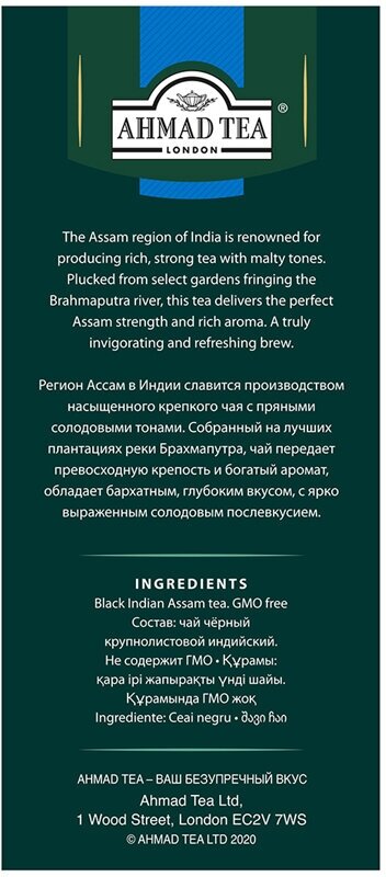 Чай черный Ahmad Tea Indian Assam 200г - это высококачественный листовой индийский чай с типсами, собранный на плантациях в долине реки Брахмапутра. При заваривании удлиненные чайные листья раскрываются и напиток приобретает глубокий темно-коричневый цвет, крепкий и даже немного вяжущий вкус; наполняется пряным ароматом с тонкими ореховыми и дымными нотками. Рекомендуем ополоснуть чайник горячей водой и только потом заваривать смесь крутым кипятком от 5 до 7 минут. Лучше всего подходит для полуденного чаепития. Упакован в герметичный металлизированный пакет и картонную коробку.