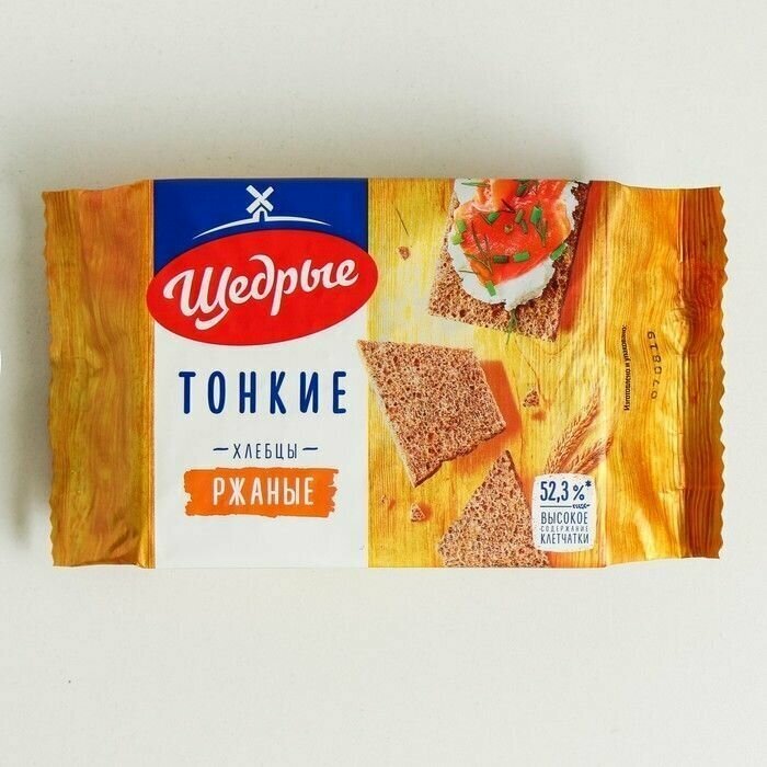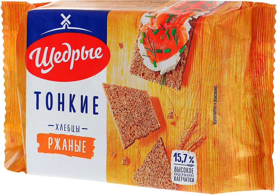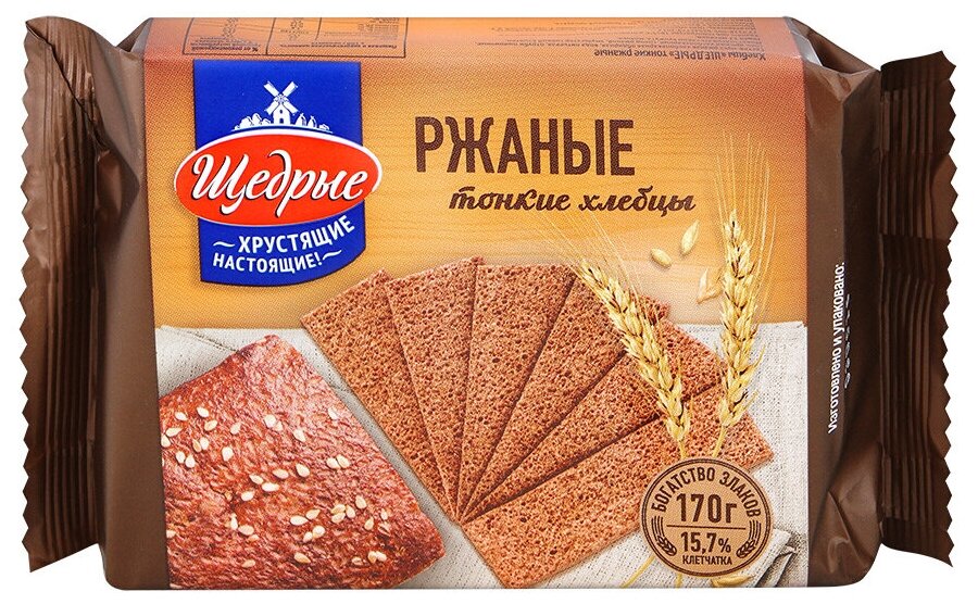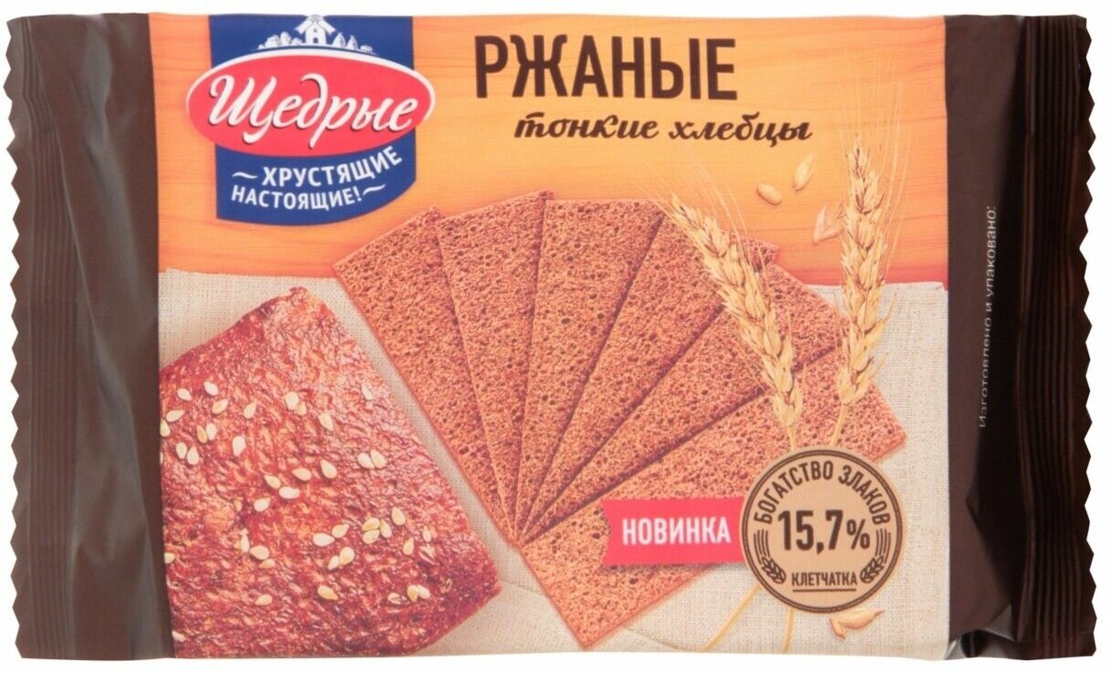 Хлебцы Щедрые Ржаные тонкие 170г - это дрожжевые хрустящие хлебцы, приготовленные из ржаной обдирной муки и пшеничных отрубей с добавлением питьевой воды и ржаного солода. Содержат 15.7% клетчатки, много витаминов группы В и минералов. Производятся по уникальной в России технологии, разработанной собственным конструкторским бюро компании. Зерновые хлебцы - это прекрасная альтернатива свежему хлебу, они подходят для приготовления легких закусок, бутербродов, сервировки сырной тарелки. Долго сохраняют свои вкусовые и питательные свойства.