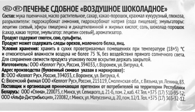| Состав | Мука пшеничная, масло растительное, сахар, какао-порошок, крахмал кукурузный, глюкоза, разрыхлители: гидрокарбонат аммония (соль углеаммонийная), гидрокарбонат натрия (сода пищевая); эмульгатор: лецетин соевый, эфиры глицерина и диацетилвинной и жирной кислот; соль, шоколад-порошок (сахар, какао тертое, эмульгатор |