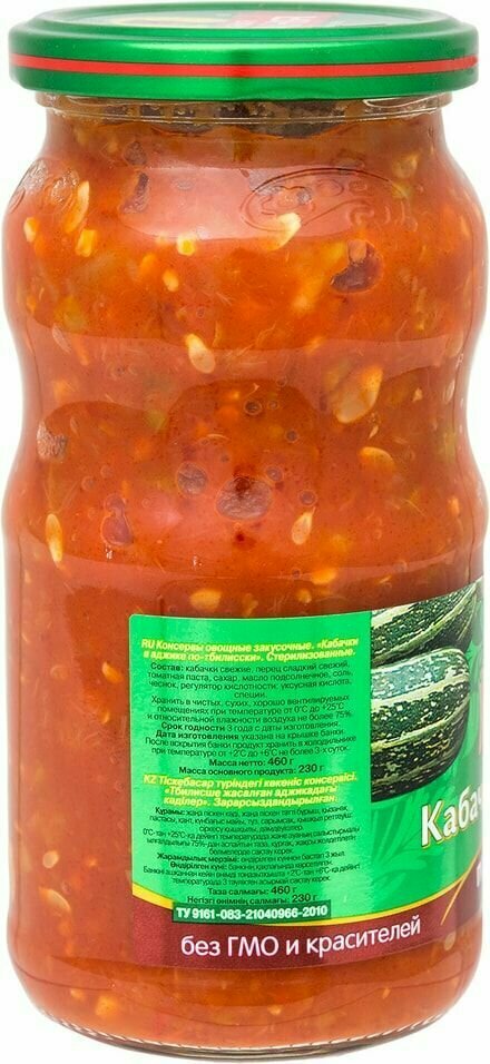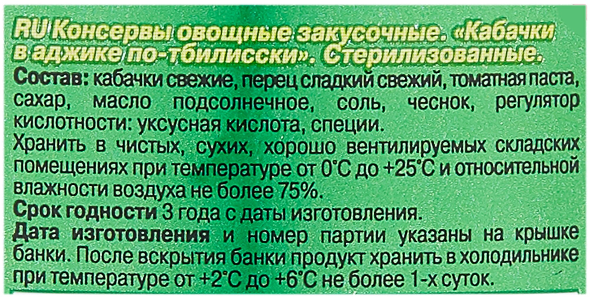 | Состав | кабачки свежие, перец сладкий свежий, томатная паста, сахар, масло подсолнечное, соль, чеснок, регулятор кислотности |