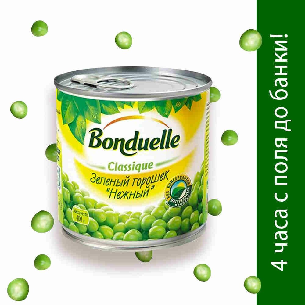 Горошек Bonduelle Classique зеленый Нежный 400г - это отборный молодой горошек мозговых сортов, попавший в эту банку не позднее, чем через 4 часа после сбора урожая. В нем содержится меньше крахмала, зато много полезных веществ и витаминов. А сколько блюд можно приготовить, используя эти нежные горошинки: непревзойденный салат Оливье, винегрет, оригинальный соус Песто, овощной суп и рагу, пышные гороховые оладушки, воздушное сливочное пюре и многое другое. Продукт не содержит консервантов, искусственных добавок и ГМО. Упакован в жестяную банку с ключом на крышке.