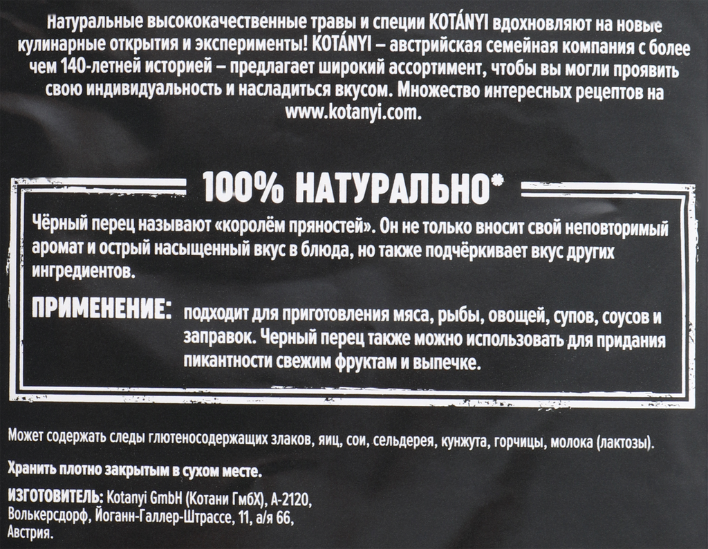 Описание товара:Чёрный перец называют «королём пряностей». Он не только вносит свой неповторимый аромат и острый насыщенный вкус в блюда, но также подчёркивает вкус других ингредиентов.Состав товара:Перец черный.Меры предосторожности:Нет ограничений по температуре. Хранить плотно закрытым в сухом месте.
