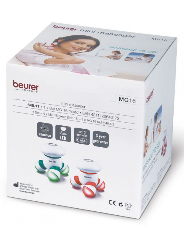 Миниатюрные размеры Beurer MG 16 позволяют брать массажер с собой на работу и в любую другую поездку. С ним вы сможете в любой момент отвлечься от компьютера и получить частичку удовольствия, помассировав в течение нескольких минут руки и предплечье. Beurer MG16 идеальный вариант для вибрационного массажа шеи, рук, спины и ног. Массаж осуществляется за счет вращения трех массажных головок. Дополнительным преимуществом выступает возможность инфракрасного прогрева.
