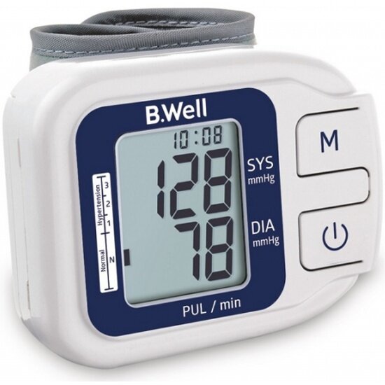 Тонометр запястный B.Well , манжета на запястье, память на 60 измерений, автоматическая накачка воздуха, питание от батарей AAAх2шт, без адаптера питания