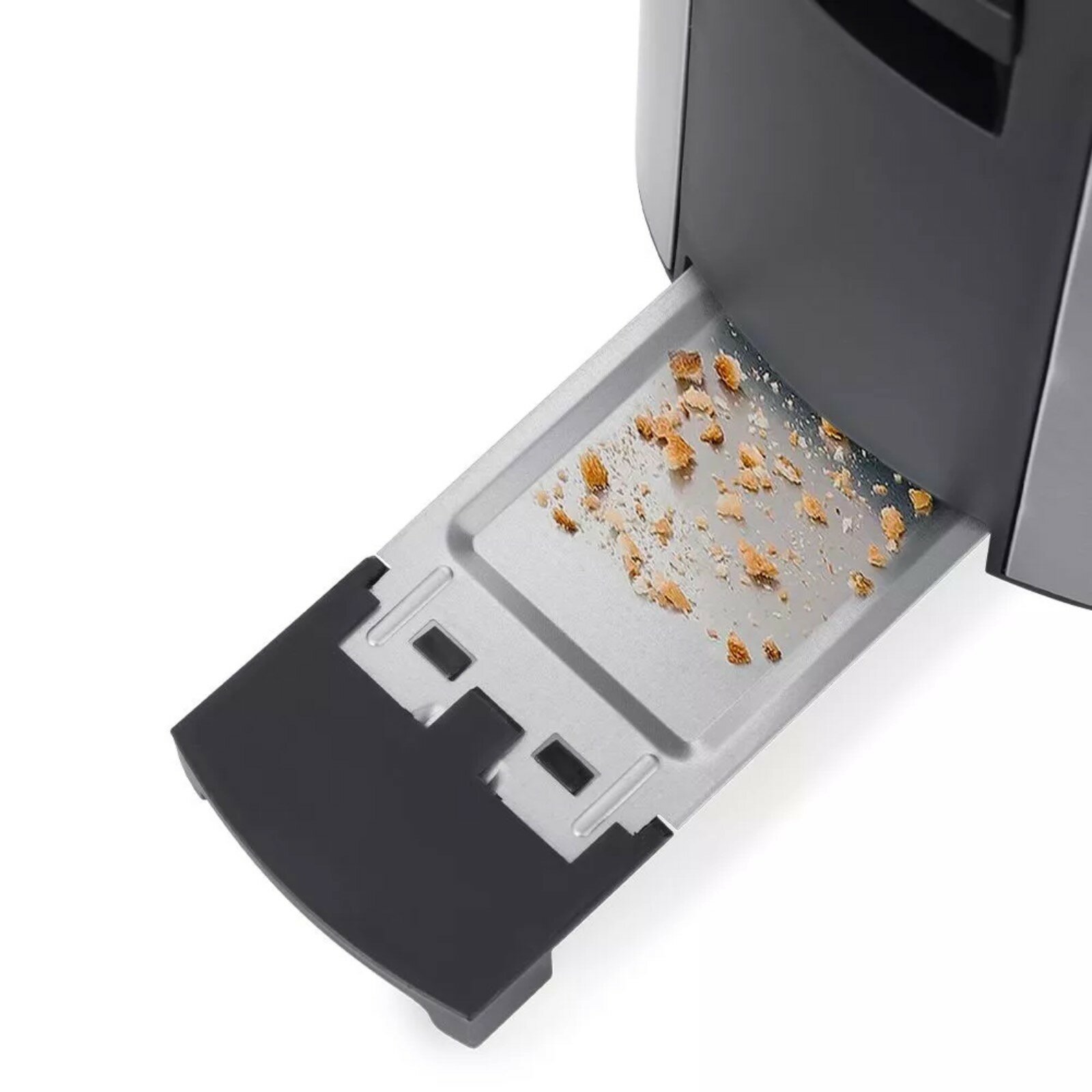 В нижней части корпуса тостера расположен съёмный поддон для сбора крошек. Просто выдвиньте его и выбросите скопившиеся крошки, а остатки протрите салфеткой.