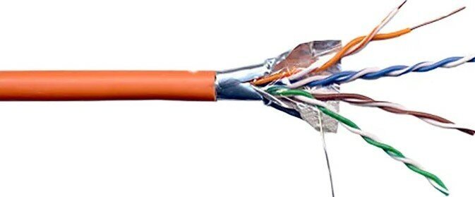 Кабель витая пара фирмы Lanmaster LAN-6EFTP-LSZH с перегородкой состоит из 4-х пар одножильных медных проводников. Каждый проводник заключен в изоляцию HDPE. Два проводника, скрученных со специально подобранным шагом, составляют одну витую пару. Пары отделены друг от друга крестообразной перегородкой увеличивающей переходное затухание между парами. 4 витых пары обернуты полиэтиленовой пленкой и вместе с медным одножильным заземляющим проводником заключены в общий экран из фольги и оболочку из LSZH. Частотный диапазон 1-250 МГц. Цветовая кодировка: пара 1 «голубой/бело-голубой»; пара 2 «оранжевый/бело-оранжевый»; пара 3 «зеленый/бело-зеленый»; пара 4 «коричневый/бело-коричневый».