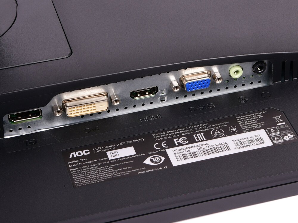 | Входные и выходные разъёмы и порты | VGA (D-Sub), Display Port, 4хUSB, Аудио разъём (для наушников), DVI-D |