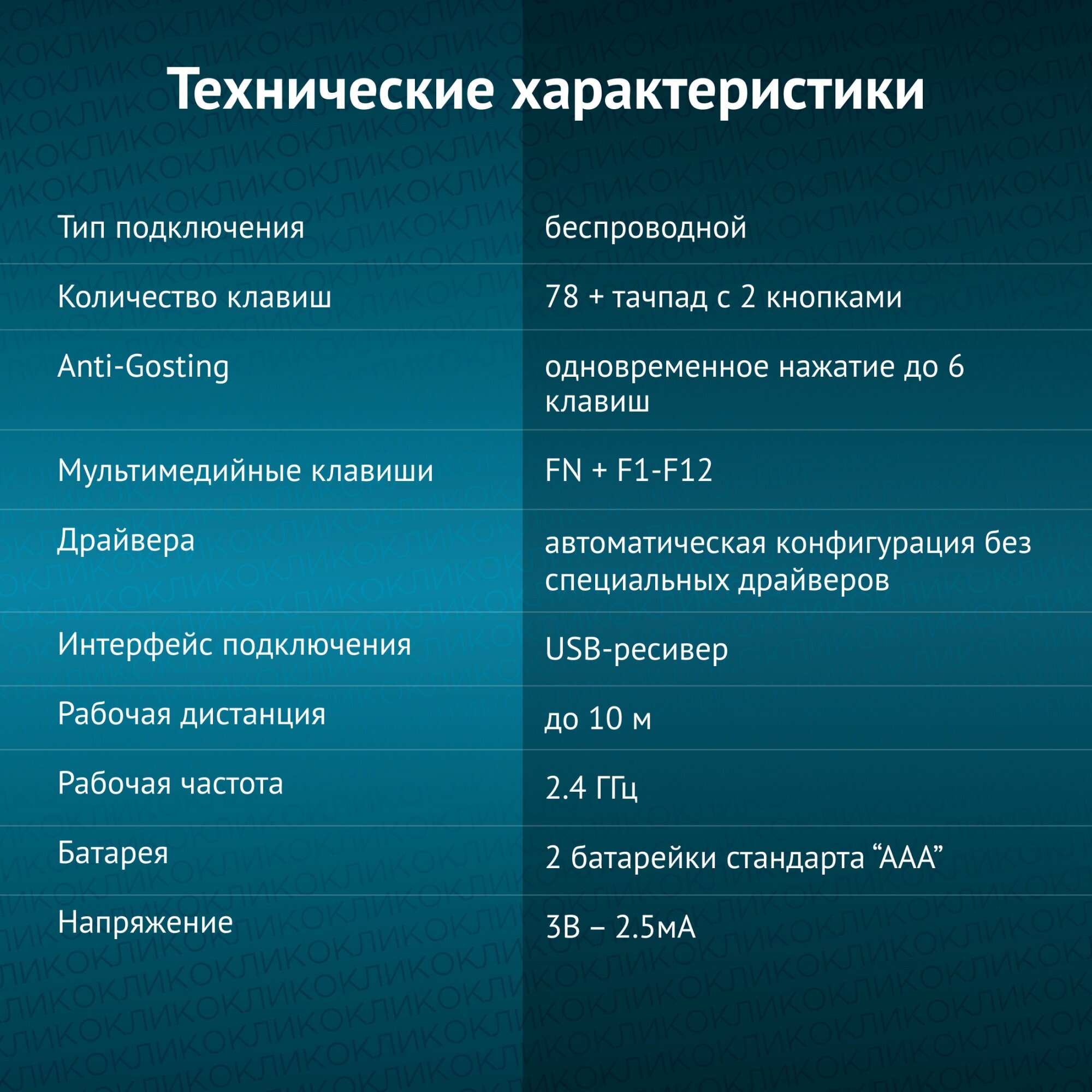 | Комплектация | Клавиатура, USB передатчик |