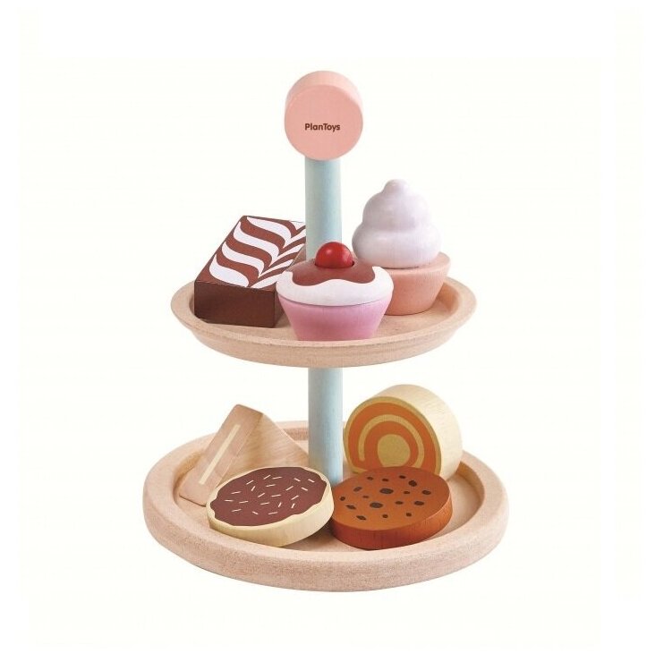Игровой набор Пирожные от Plan Toys — это деревянная игрушка, с которой можно каждый день устраивать праздник!В набор входит двухъярусная этажерка, 7 видов пирожных.С набором Пирожные можно устроить множество ролевых игр (магазин, чаепитие, праздник, кафе и др).Игровые наборы благоприятно влияют на раннее развитие ребенка, стимулируют развитие логического мышления, мелкой моторики.