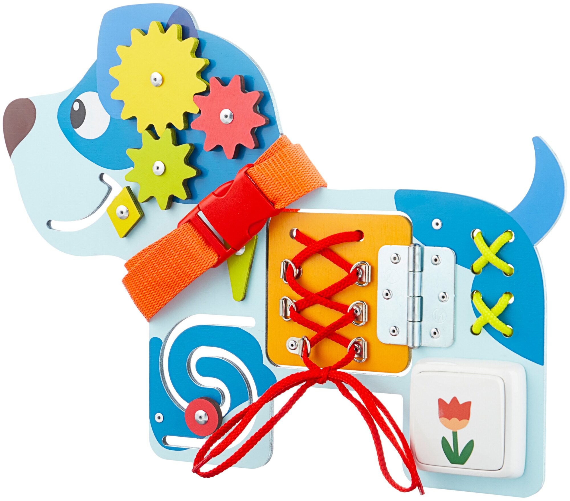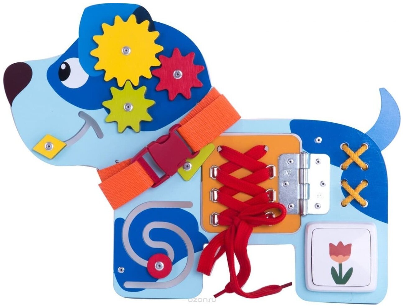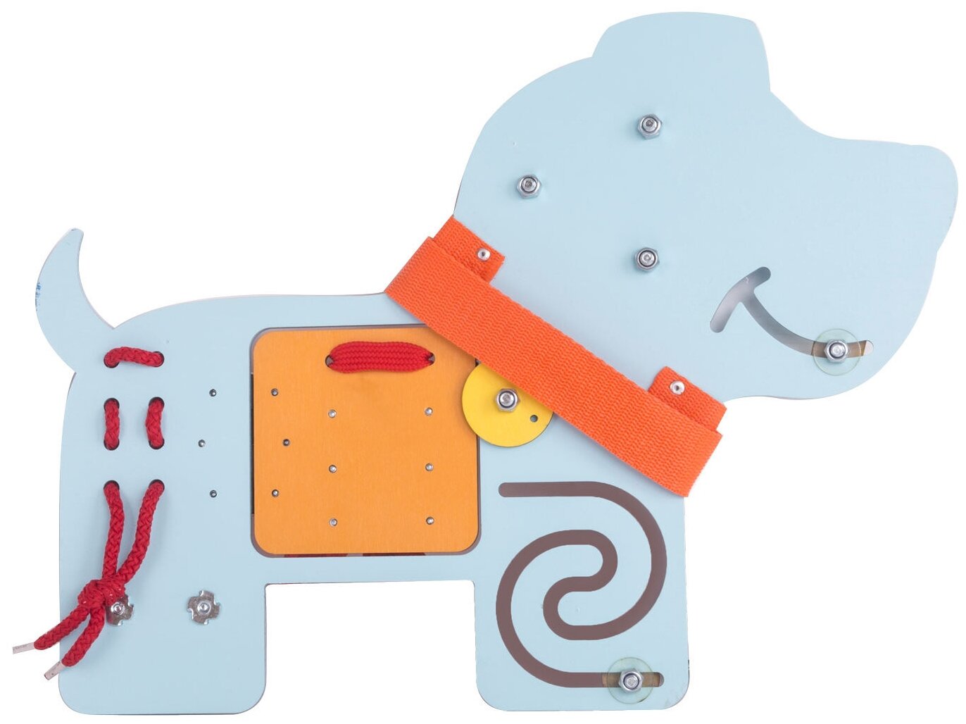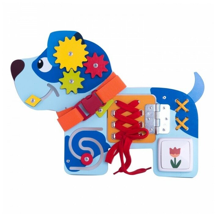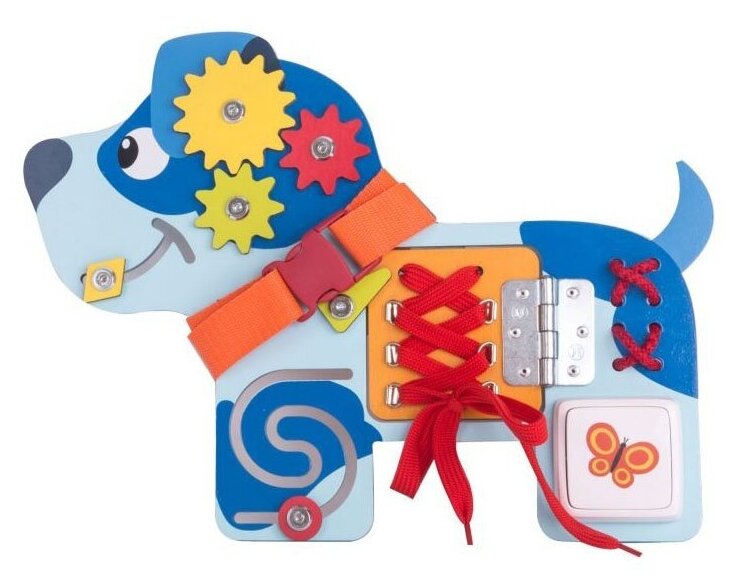 Собачка по имени «Гав-Гав» с радостью поучаствует в веселых играх! Бизиборд повторяет очертания этого славного персонажа. С ним точно не будет скучно, потому что здесь очень много занятных вещей: три яркие шестеренки, которые крутятся в разные стороны; застежки на ошейнике собачки; бегунки (один из них двигается по змейке-лабиринту), замысловатая шнуровка; а также выключатель.
