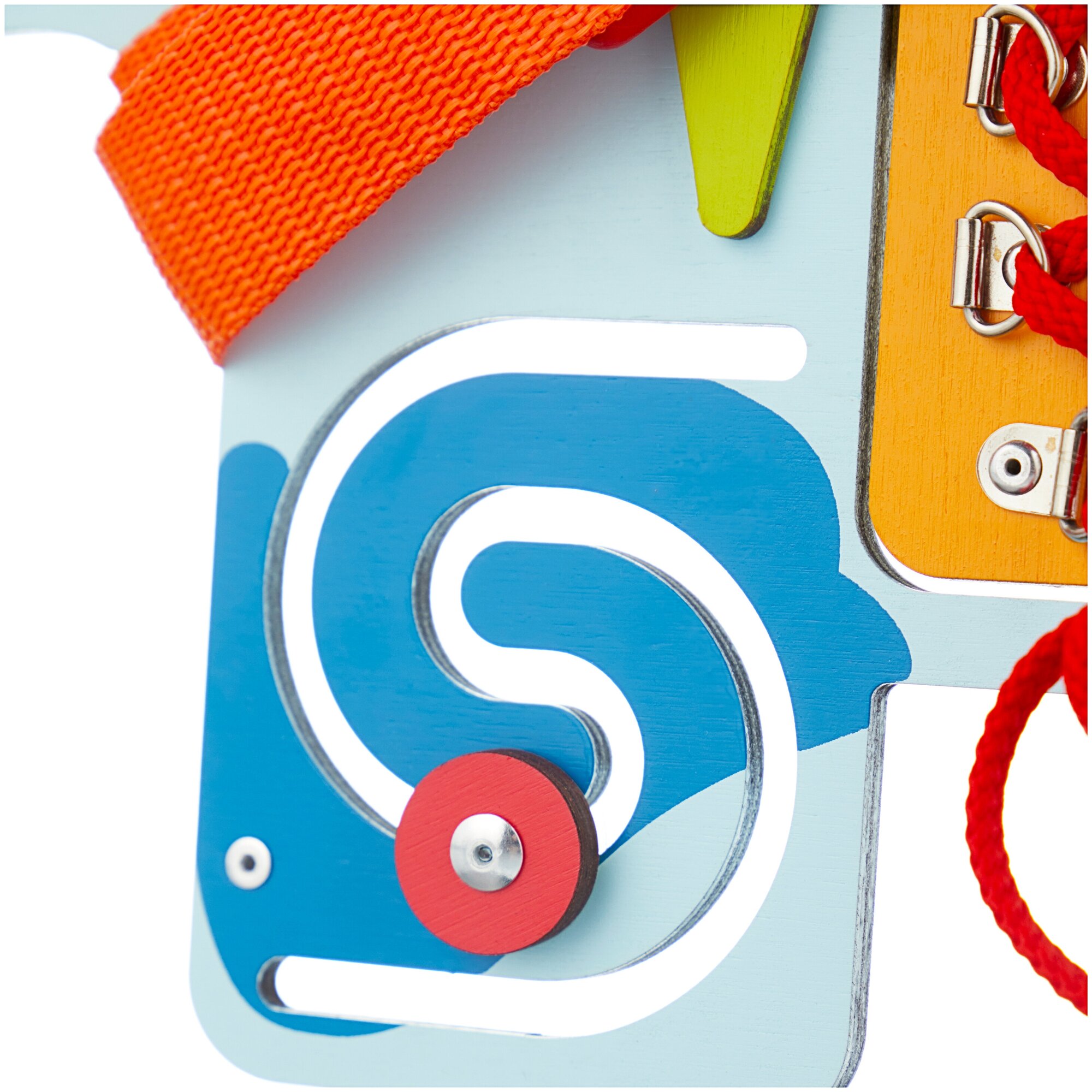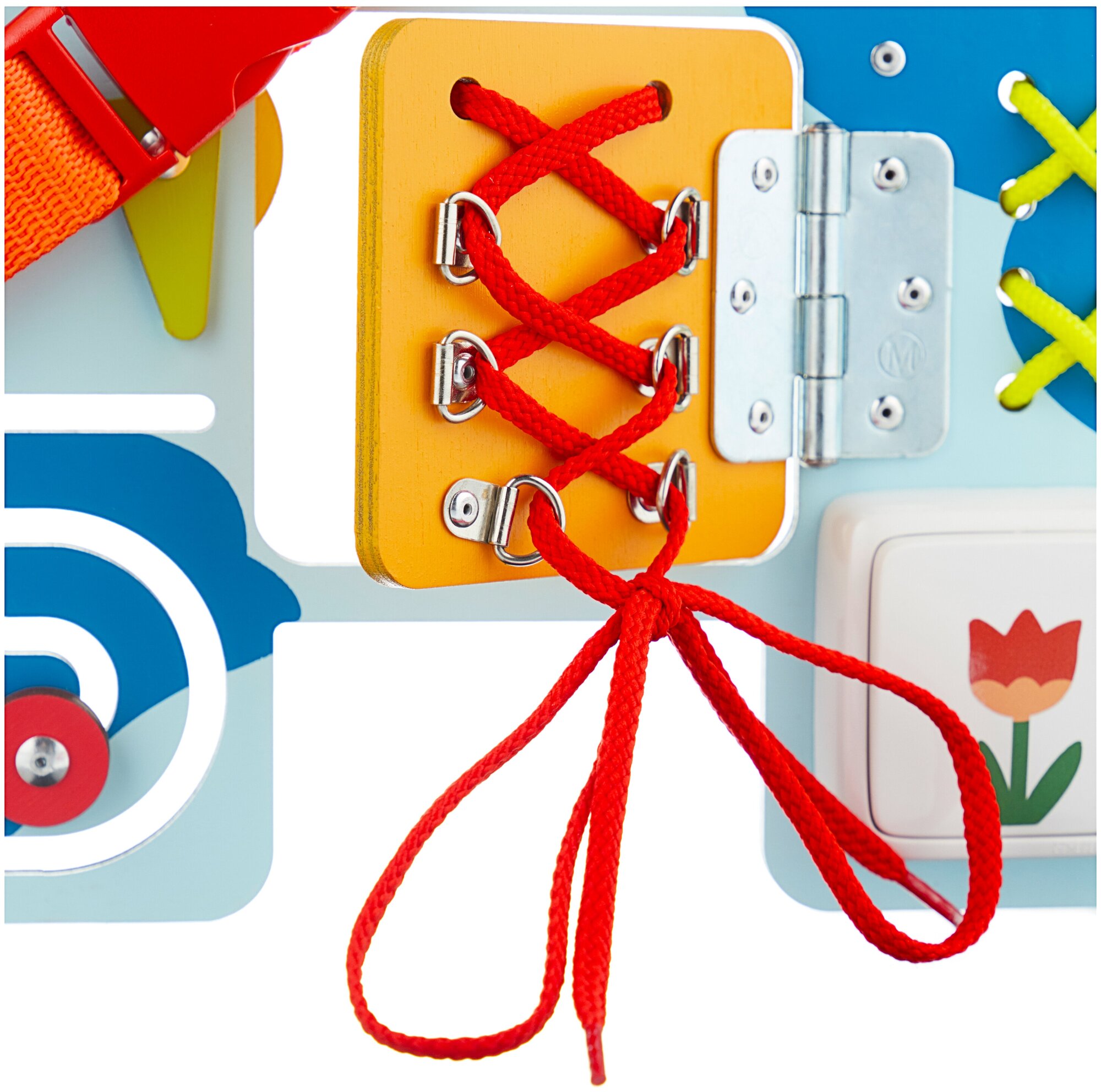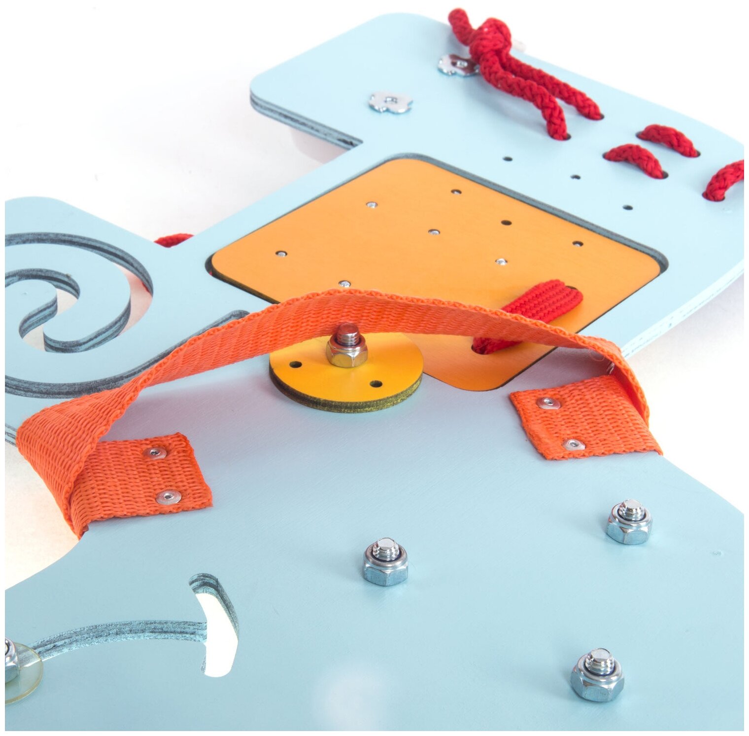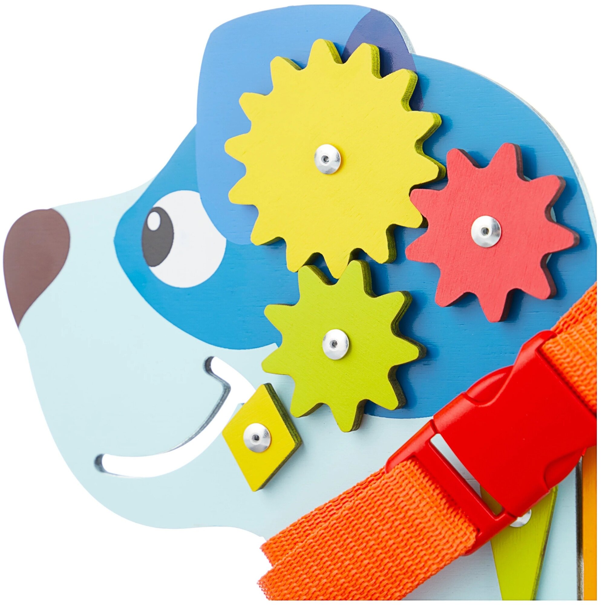 Собачка по имени «Гав-Гав» с радостью поучаствует в веселых играх! Бизиборд повторяет очертания этого славного персонажа. С ним точно не будет скучно, потому что здесь очень много занятных вещей: три яркие шестеренки, которые крутятся в разные стороны; застежки на ошейнике собачки; бегунки (один из них двигается по змейке-лабиринту), замысловатая шнуровка; а также выключатель.