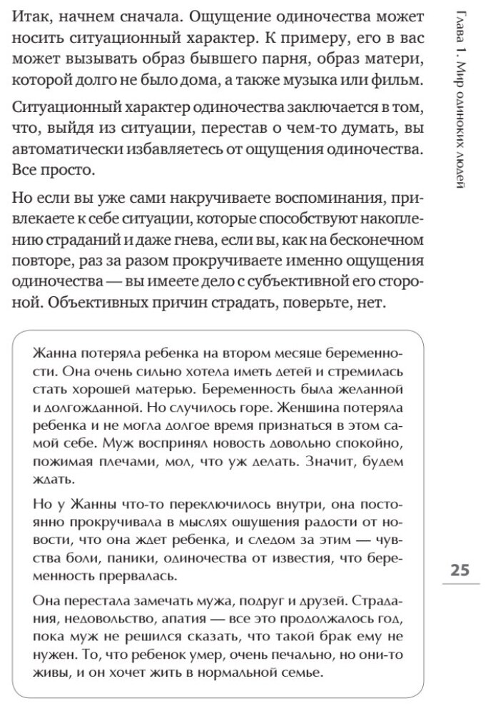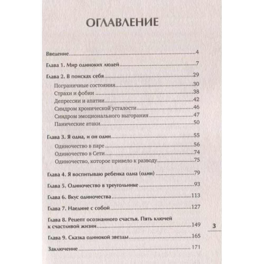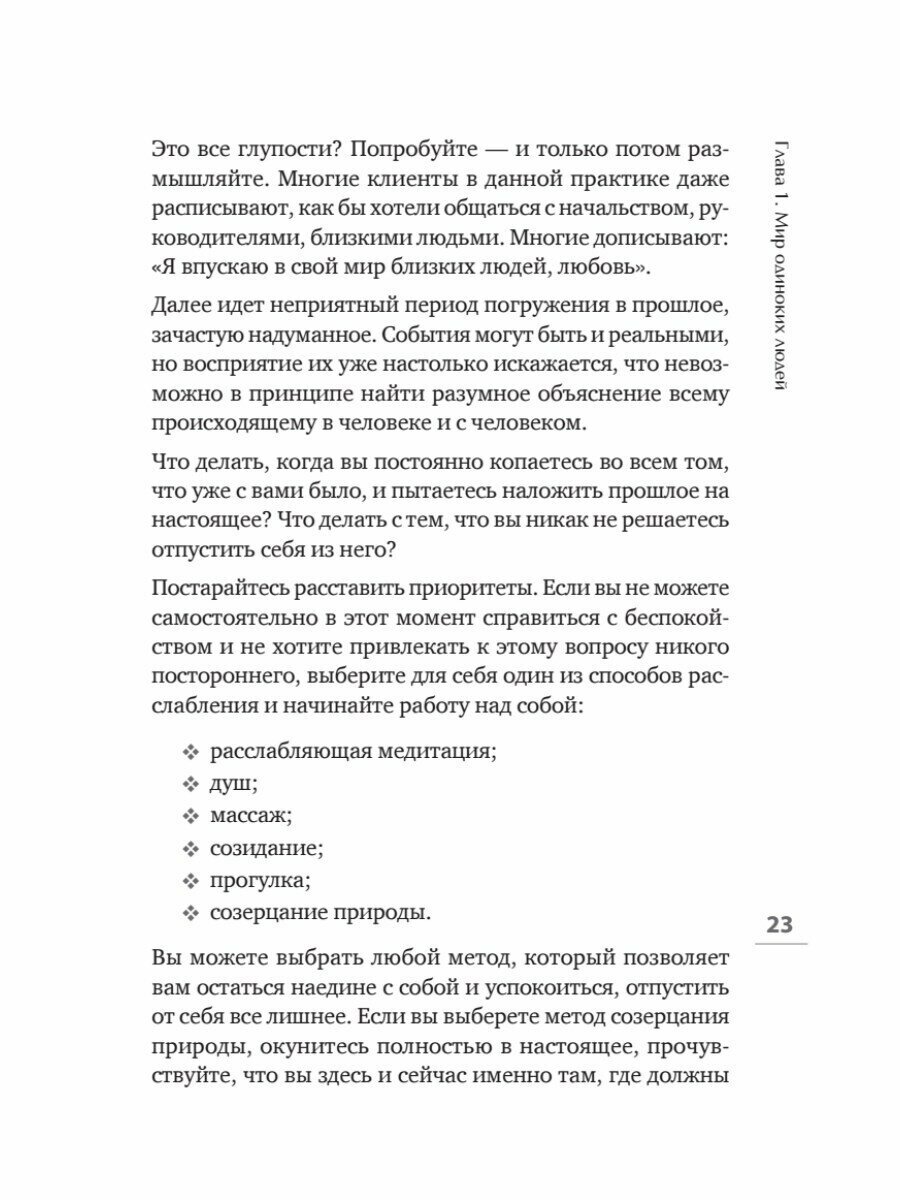 Одиночество - это одно из самых страшных состояний, которое мы себе представляем. Многие люди выходят замуж и женятся только с одной целью - избежать одиночества. И именно в отношениях обнаруживают, что одиночество вдвоем - самое страшное. В новой книге психолога Анны Березовской вы найдете причины и виды одиночества, которые случаются в жизни человека. Вам будут предложены методы выхода из различных психологических состояний, связанных с одиночеством (депрессия, апатия, профессиональное выгорание, "заедание" одиночества). Книга наполнена примерами из жизни, автором описаны психосоматические практики. В конце книги дана психологическая сказка, позволяющая каждому индивидуально осознать возможности выхода из различных видов одиночества.