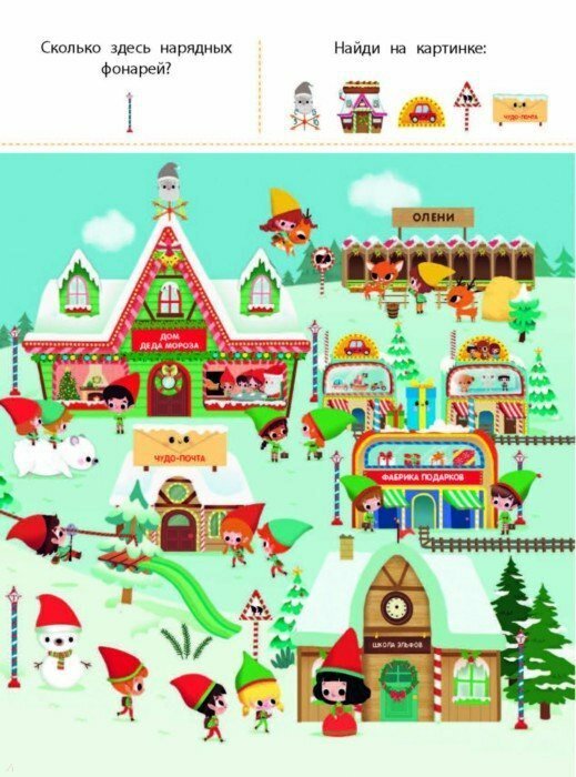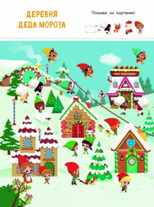 На каждом развороте малышу предстоит рассмотреть красочную детальную иллюстрацию и найти на ней что-то очень новогоднее - от имбирных пряников и спрятанных в комнате подарков до самого Деда Мороза и его эльфов-помощников.